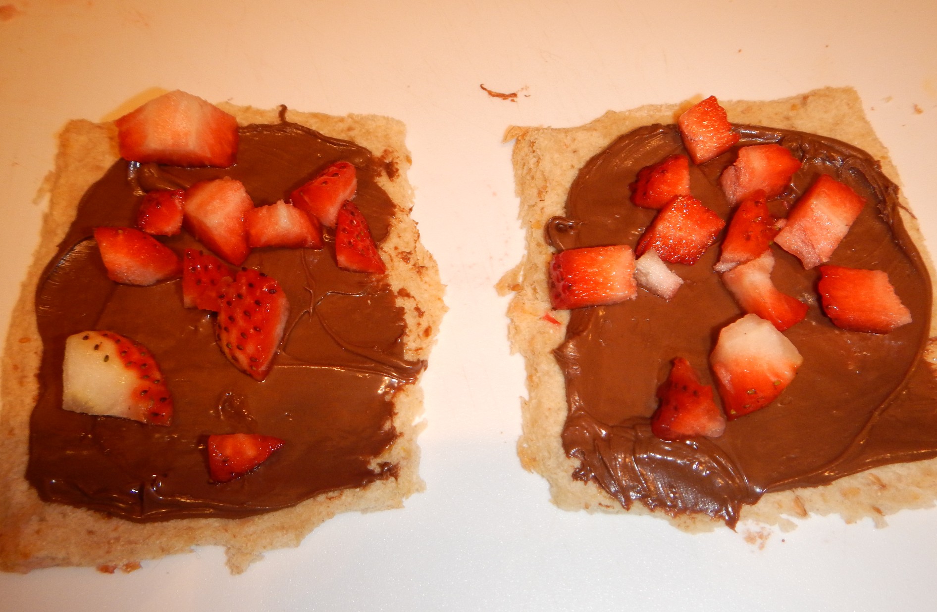 Bred på ett lager av Nutella och lite smått hackad jordgubbe.