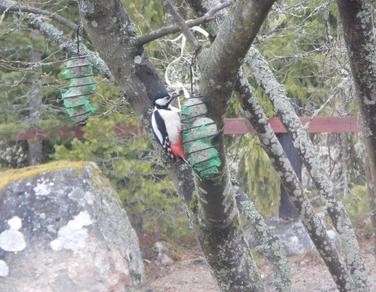 Idag har det verkligen varit vårväder, upp mot nio grader och Hacke Hackspett har passat på att njuta av de sista resterna från denna vinters måltider. Rolf och grannen har sågat ner lite träd, så nu är veden räddad för de närmaste två åren. Det är onekligen skönt att värma sig framför en brasa när det blåser kring knutarna. Nu går vi dock mot varmare tider vilket har märkts idag, vi passade på att sitta ute och njuta av solvärmen en stund.