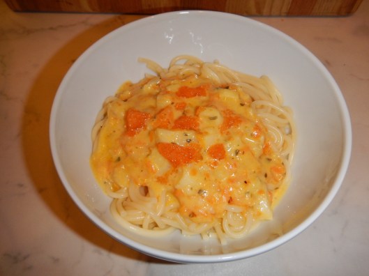 En långpromenad med hunden och därefter kaffe tillsammans med en grannfru, ja tiden flög iväg. Plötsligt var det dags för middag, jag förstod det eftersom Rolf lite försynt frågade; vad bjuder du på idag? Middag, ja jag hade faktiskt tänkt göra det lätt för mig, en färdig fisksoppa och i den lägga lite lax. Men för att göra den mer matig rev jag ett par morötter och fräste mjuka i lite smör, ingen lax i frysen men väl en portion torskfilé. Nåja man kan ju inte komma ihåg allt. Så fram med ”soppåsen” fel igen. Det var inte soppa det var pastasås!