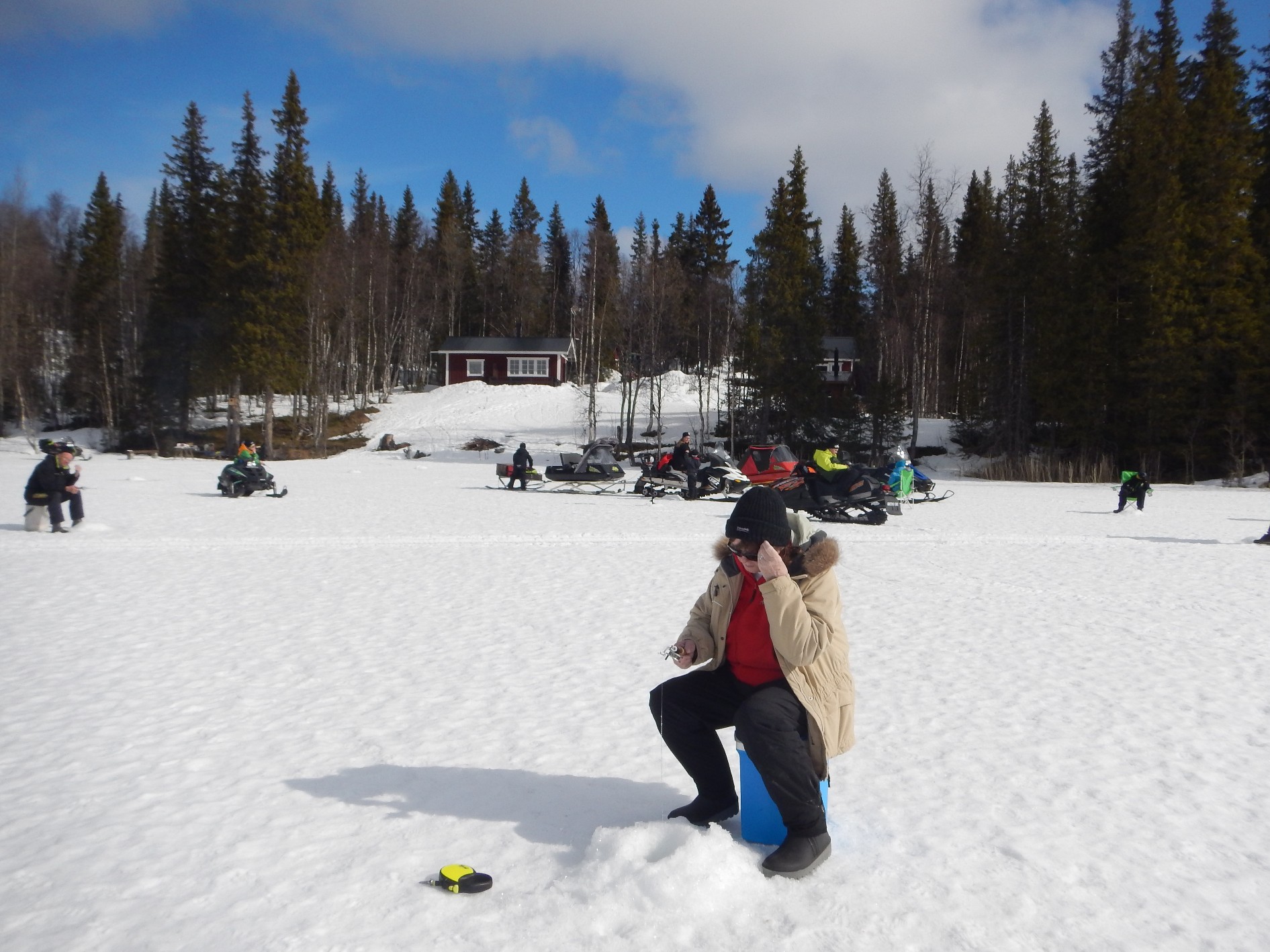 Den ägde rum på Makkes tjärn och vi var nog runt 50 -60 personer den var till för boende i byn. Tjärnen är väldigt djup så det är inte lätt att veta hur lång lina man ska ha. Sedan gällde det att ha avstånd så man inte lurade fram nån fisk åt någon annan. Nåväl det hela höll på i två timmar och jag satt troget och stirrade på mitt lilla spö.