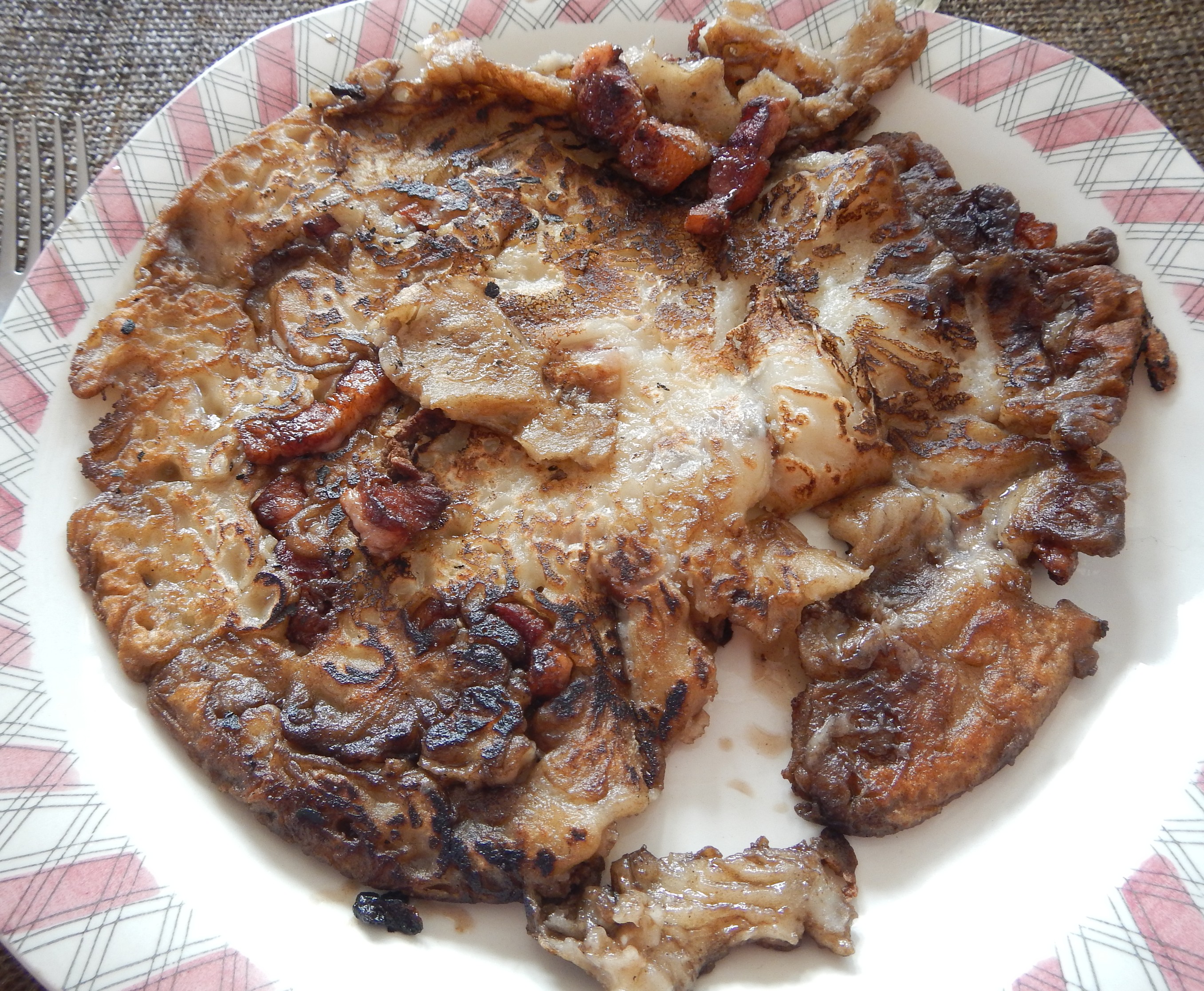 Tärna fläsket och bryn det i stekpannan. Under tiden vispar du ihop vetemjöl/kornmjöl med vattnet och saltet. Behåll ungefär en fjärdedel av fläsket i stekpannan och lägg det andra åt sidan för stunden. Häll en del av smeten i stekpannan över fläsket och stek det på hög värme.