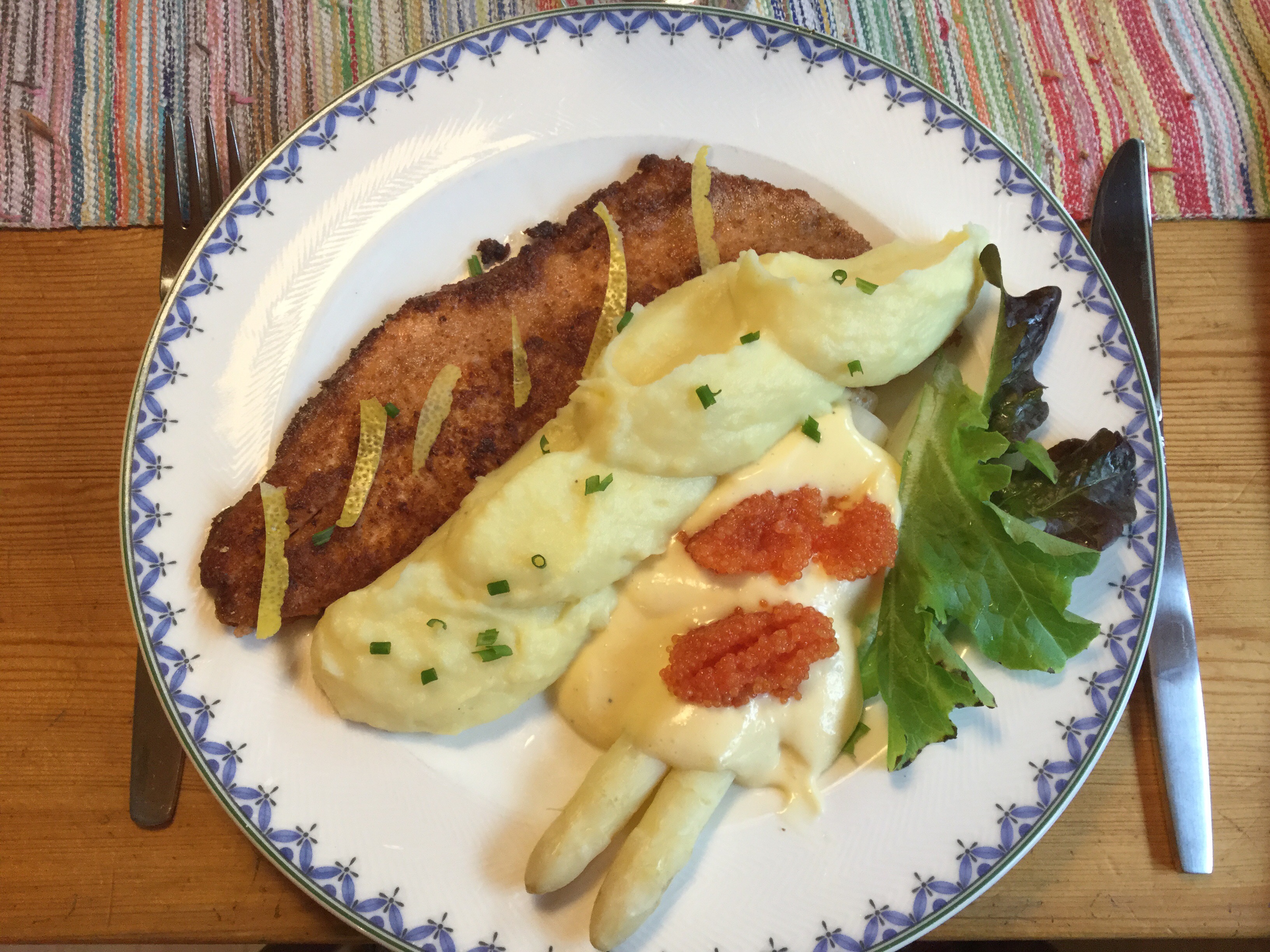Idag är det den tjugonionde april och knappast vårväder ute men det får vara som det vill med den saken nu är det vår. Vitsipporna blommar och i morgon är det valborgsfirande lite överallt. Därmed är våren här och jag fick sån lust att laga en riktig vårmiddag idag. Rolf var ju upptagen av att se vilka som blev svenska mästare i ishockey, viktigt det där. Nåväl jag bjöd på, rödingfilé med vit sparris och hollandaise samt kaviar och inte minst hemlagad potatismos. Även fast jag lagat det själv måste jag säga att det var riktigt gott. Enda nackdelen var väl i så fall att rödingen inte var fiskad i Lövsjön utan köpt.