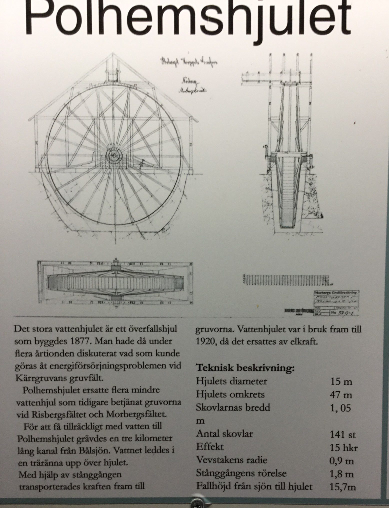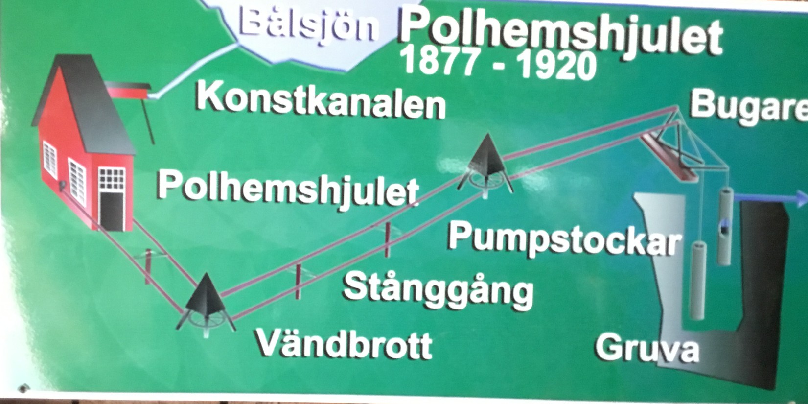 Strax utanför Norberg finns Polhelmshjulet beläget och på bilden ovanför kan man se lite av hur anläggningen var byggd. Vatten togs från Bålsjön och transporterades via en träkonstruktion/kanaler till gruvan. Vad är en stånggång? Stånggången är den mekaniska delen av kraftöverföringen. Från vattenhjulets vevaxlar överförs kraften genom långa stänger, som fungerar som ’vevstakar’, hängande i luften på stolpar. Genom vattenhjulets vevaxlar åstadkoms en framåt-bakåtgående rörelse, som genom de skarvade stängerna kan överföra energin på långa sträckor. Det med kursiv stil skrivna är text taget från internet.