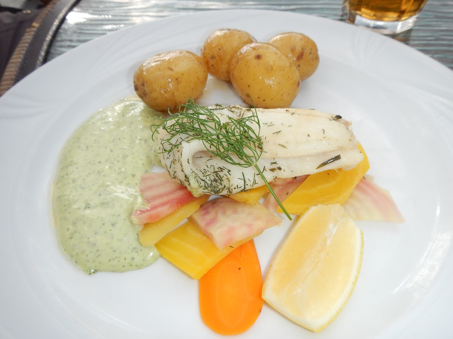 Halstrad Röding, serveras med smörsås på ingefära och apelsin, ångad Romanesco och potatisstomp. Ja nu blev jag hungrig igen, deras mat kan verkligen rekommenderas. Eftersom den är öppen året om kan jag tänka mig att det serveras lite julaktig mat här i december, kanske värt ett nytt besök då.