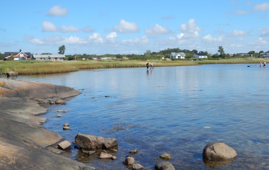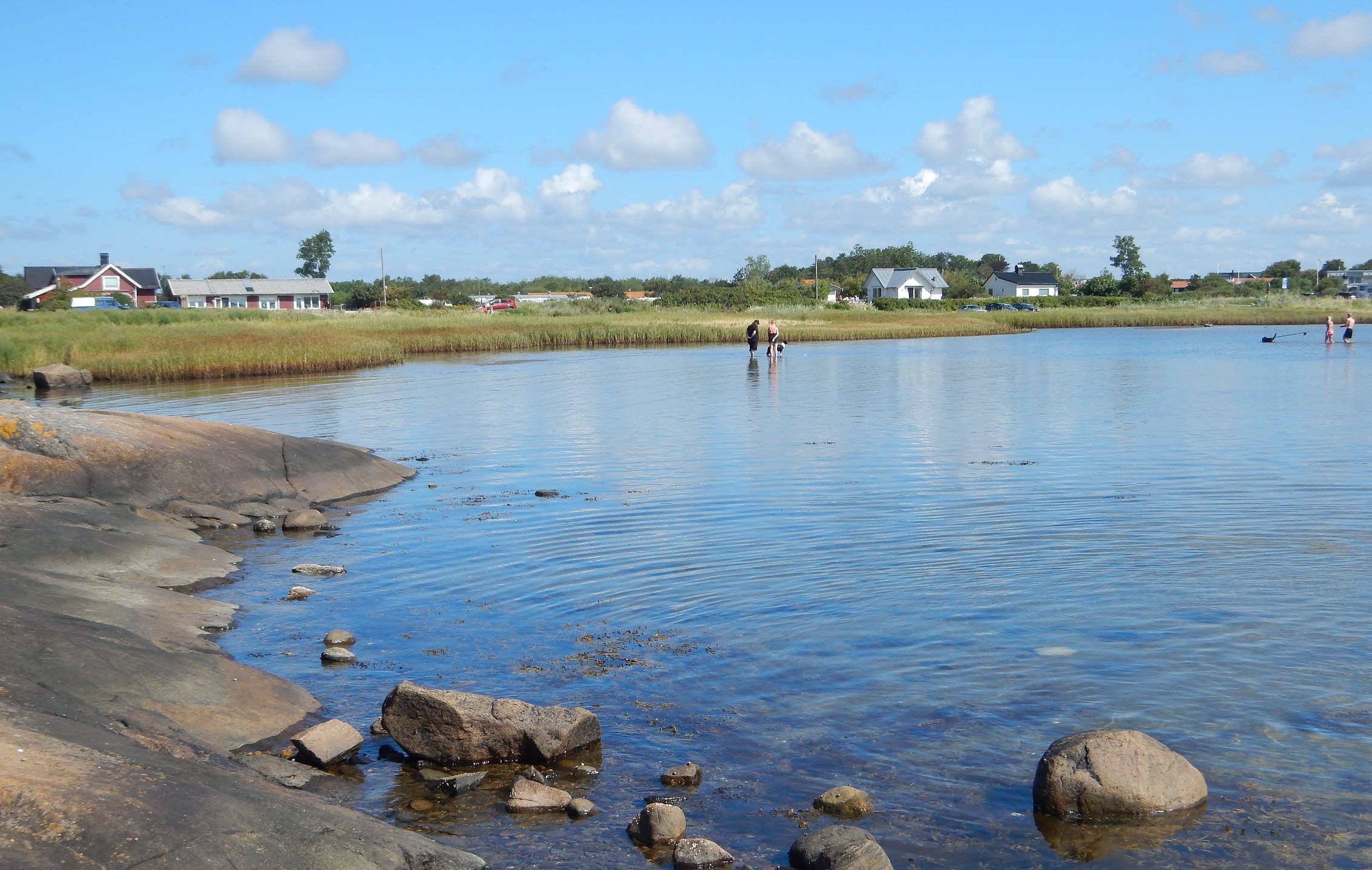 Här ses området från havssidan och då förstår man att det kan kallas strandnära. Det är oftast Rolf som går på hundpromenaderna, på så sätt lär han känna såväl nya hundar som hundägare. Ibland dyker det upp en och annan bekant också. På Getterön blir det ofta vattenpromenader eftersom vår hund älskar vatten och att bada, tittar man längst upp på bilden kan man se Rolf o Bachus i ett samtal med någon.