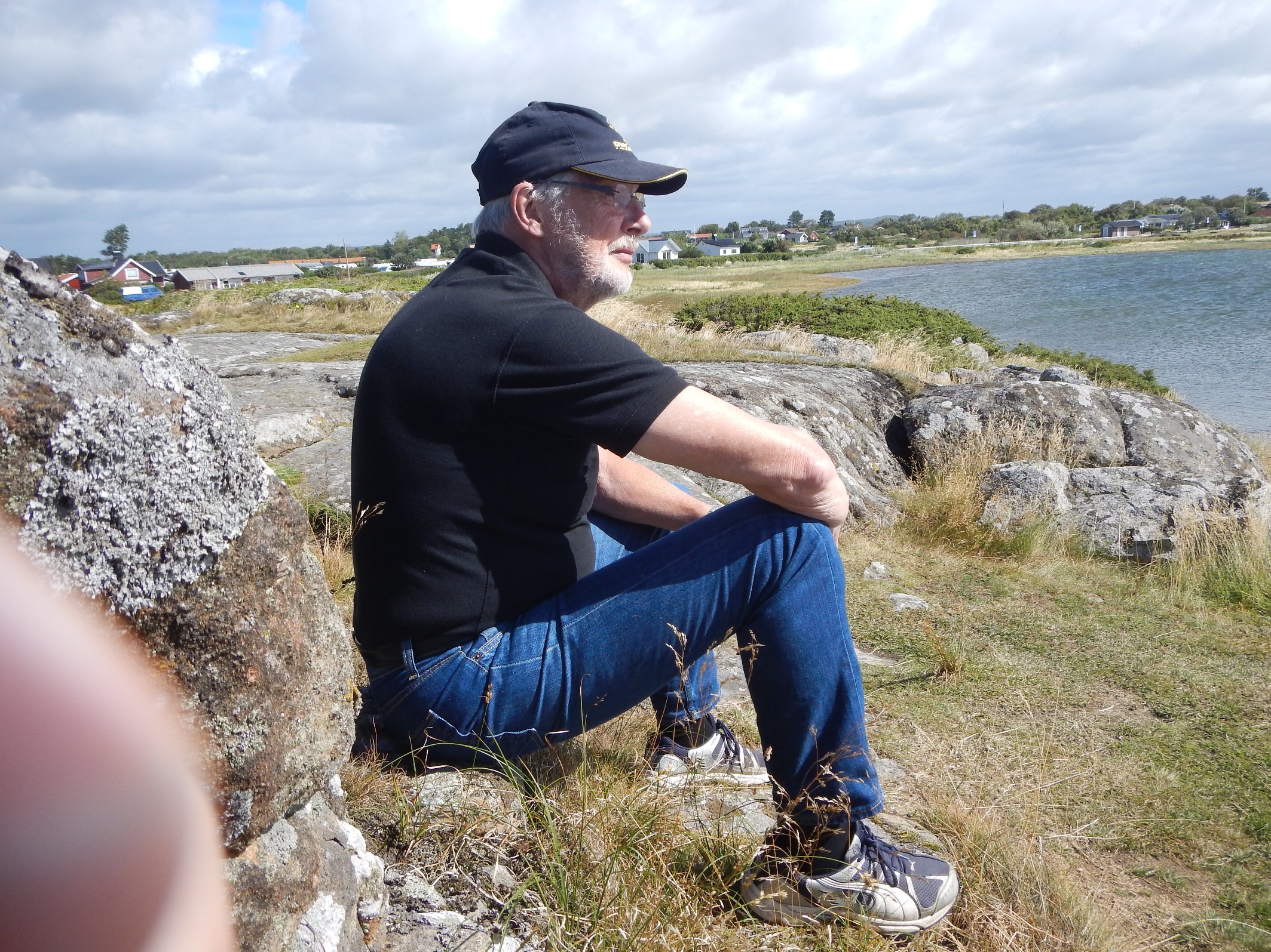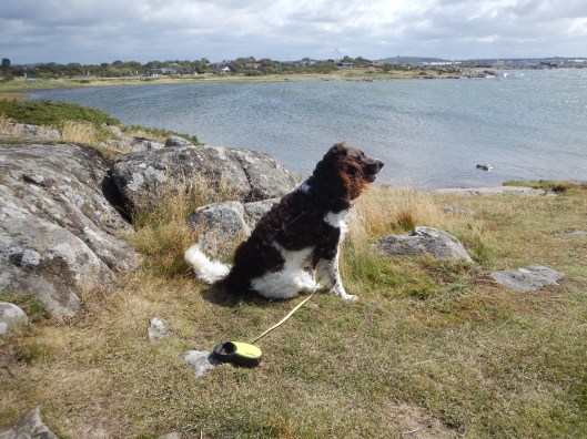 Rolf avstår simturen eftersom det är lite kallt och han inte har samma typ av päls som hunden. Men att kolla in båtarna vid horisonten är trevligt det också.