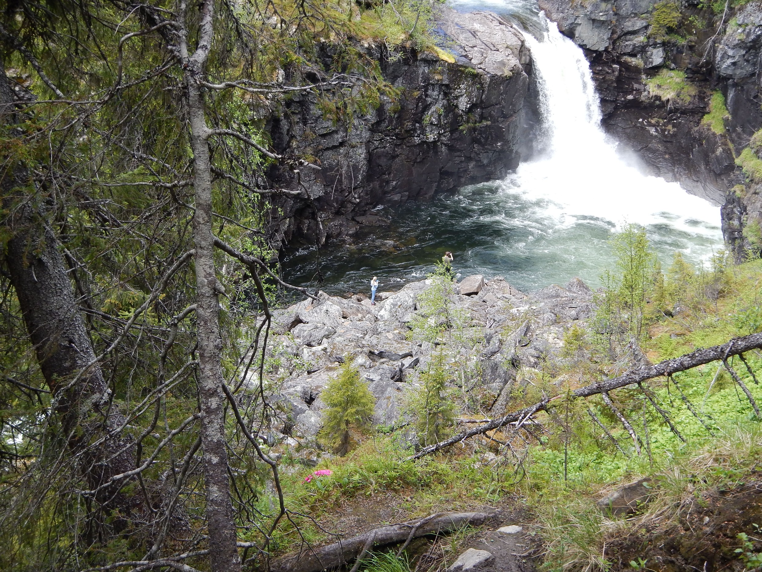 När vi gick tillbaka såg vi skylten Storfallet, det är ett vattenfall i Slipsikån och har en fallhöjd på tio meter. Vägen ner är brant, mycket stenig och hal. Rolf föredrog att dokumentera det hela och jag stod bredvid o hejade på.