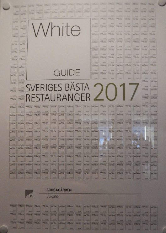 I White Guide Nordic 2016 kom Borgagården tvåa i norrland i klassen ”Årets Värt en resa”. På såväl som utsida som insida av restaurangen kan man se ett otal med utmärkelser av alla de slag. Jag orkade inte läsa alla men tog ett par bilder, här ovan är det en vad gäller White guide Sveriges bästa restauranger”.