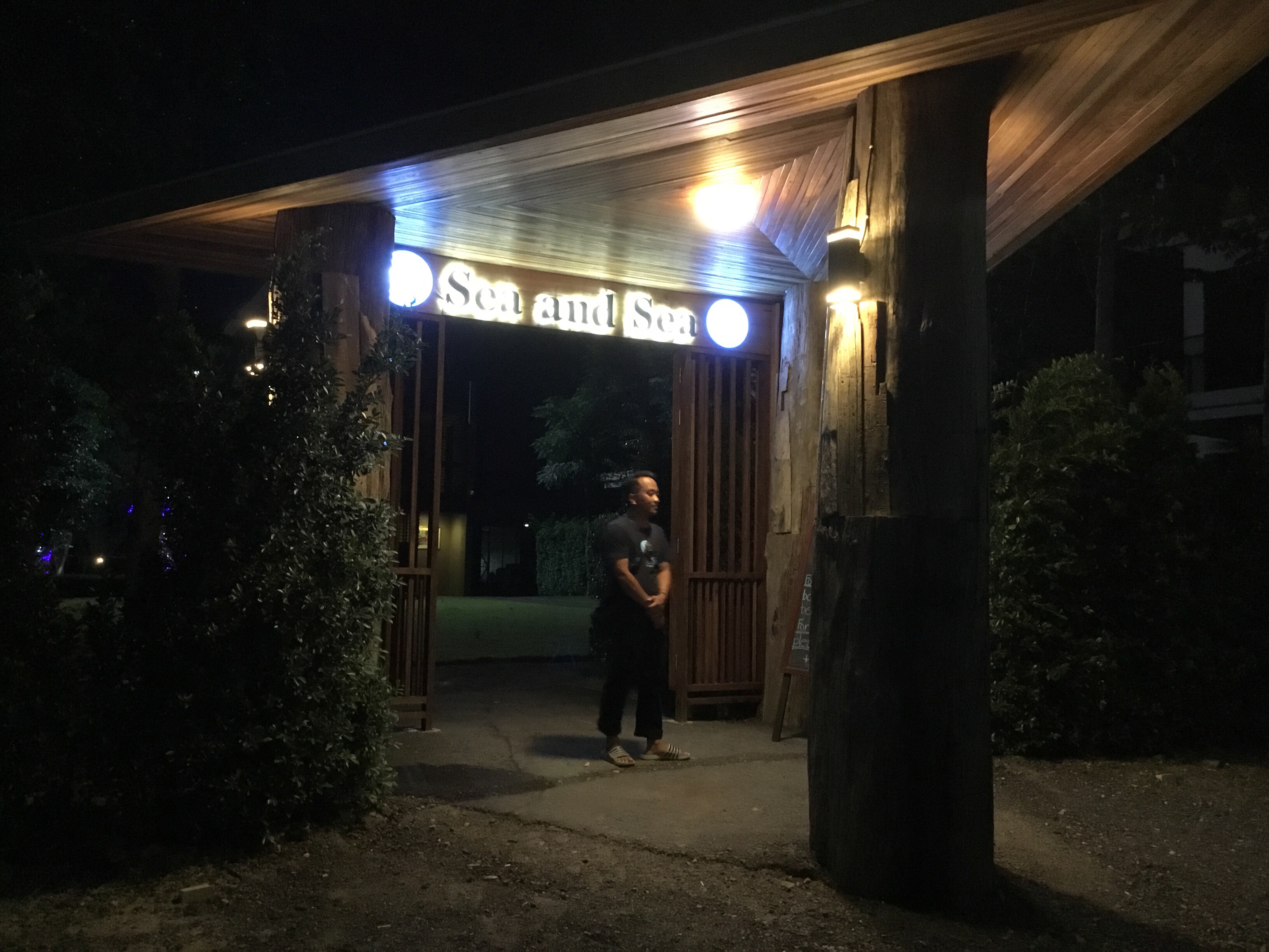 Svåraste beslutet varje dag är, var och vad ska vi äta idag? Det blev Sea and Sea, tillsammans med några trevliga grannar beslöt vi att besöka denna restaurang/resort. För oss var det första gången så lite nyfikna var vi allt. Det ligger en bit ifrån där vi bor och eftersom det inte finns några lampor efter vägen är det inte så roligt att sig dit kvällstid om man inte har bil. Nu var det inga problem eftersom man kan ringa dit och be att de kommer och hämtar sina gäster det gör de utan kostnad.