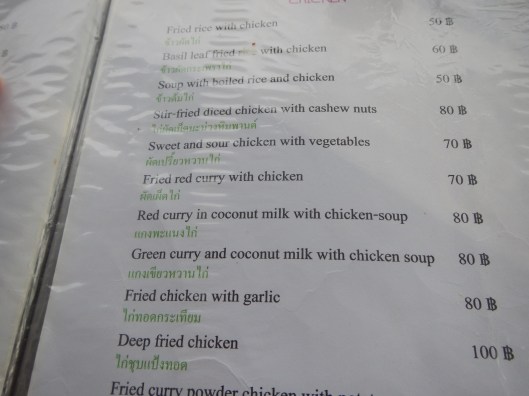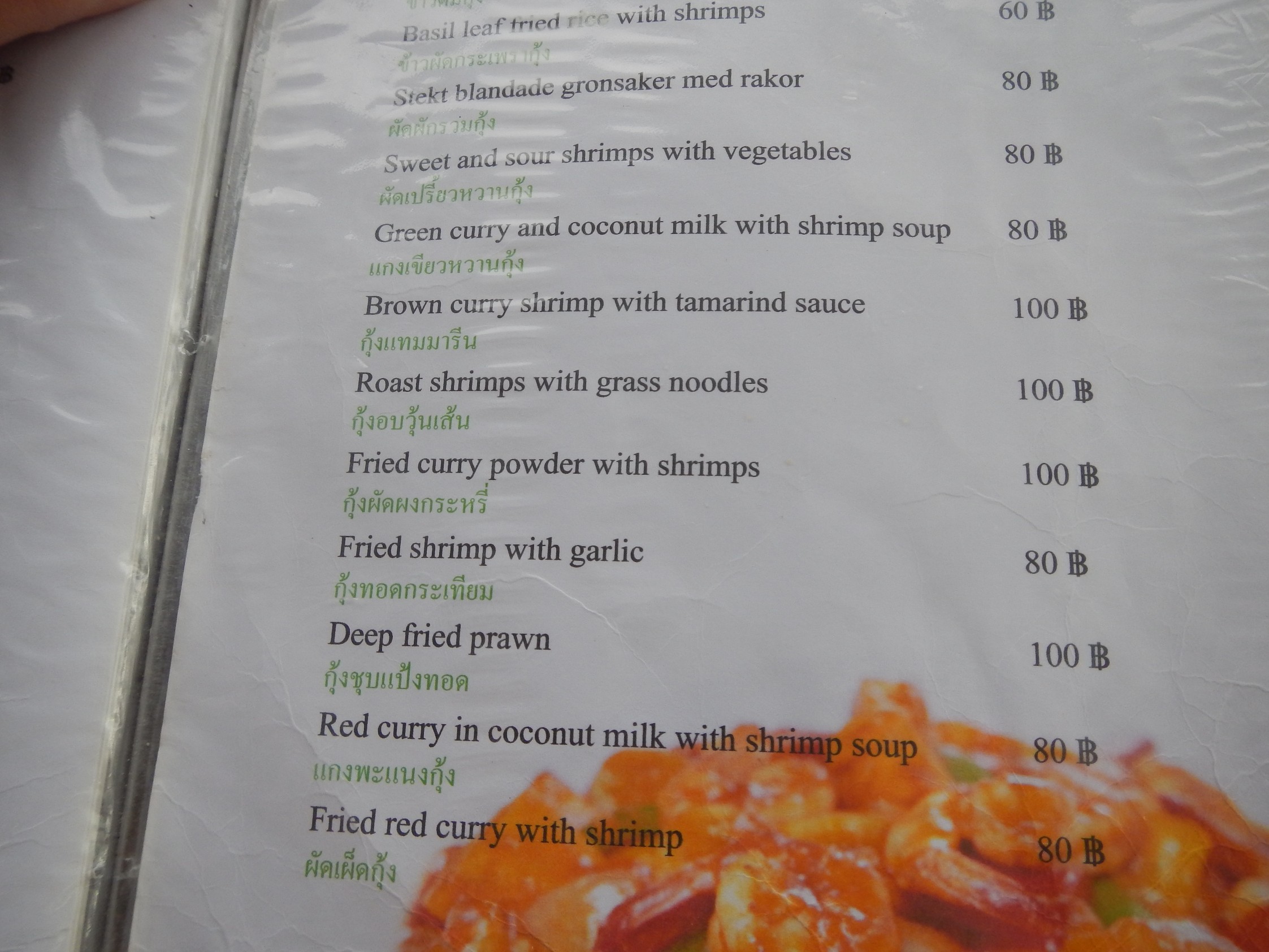 Som vanligt visar jag två menyer det kan ju vara roligt att veta vad som väntar om man kommer ner hit. För egen del tog jag Fried shrimp with garlic och som vanligt vatten (100THN)