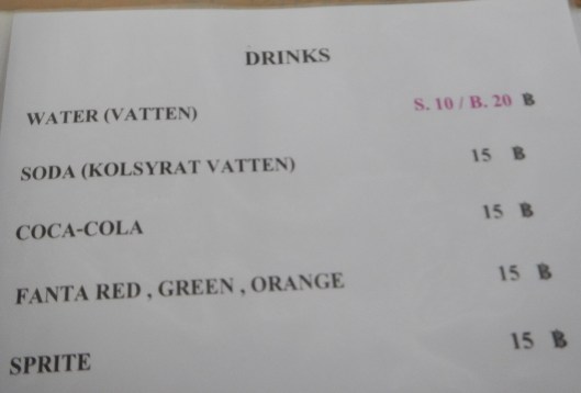En vanlig storlek vatten för tio bath eller läsk för 15 bath är normalpris men en del restauranger tar det dubbla.