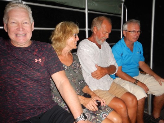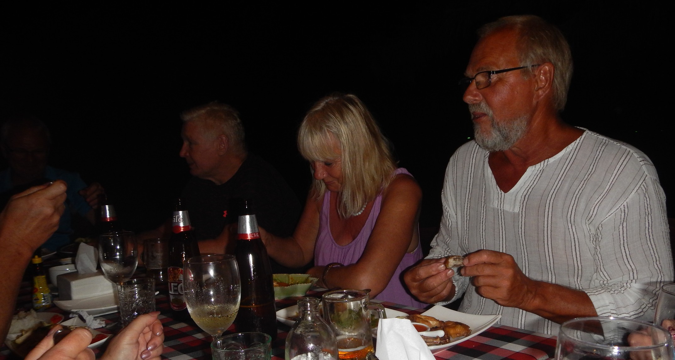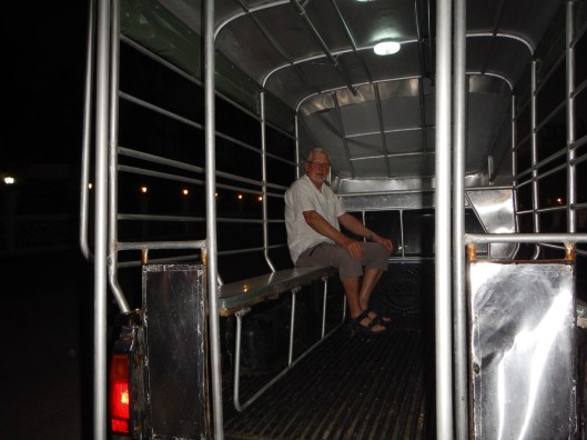 Det finns alltid ett skäl om man känner för att fira och nu har ytterligare ett par från den gamla tiden kommit hit. Det är alltid lika trevligt att träffas, efter femton år har vi lärt känna varandra ganska väl, så det blev ännu en kväll på Sea and Sea. Det hänger skyltar med deras namn och telefonnummer efter vägarna, vill man dit ringer man bara och beställer hämtning. Det är gratis men 20 THB i dricks till chauffören är väl skäligt.