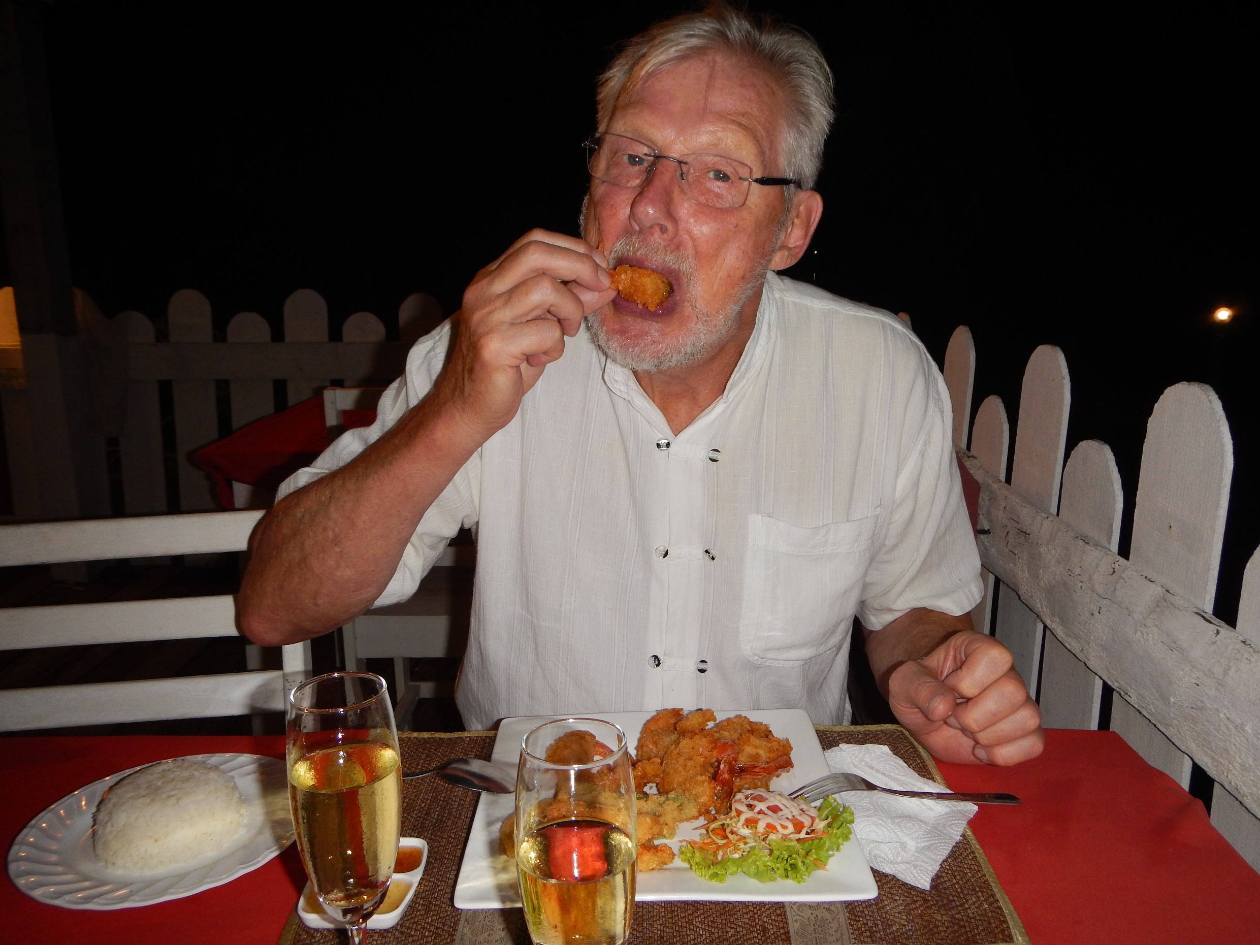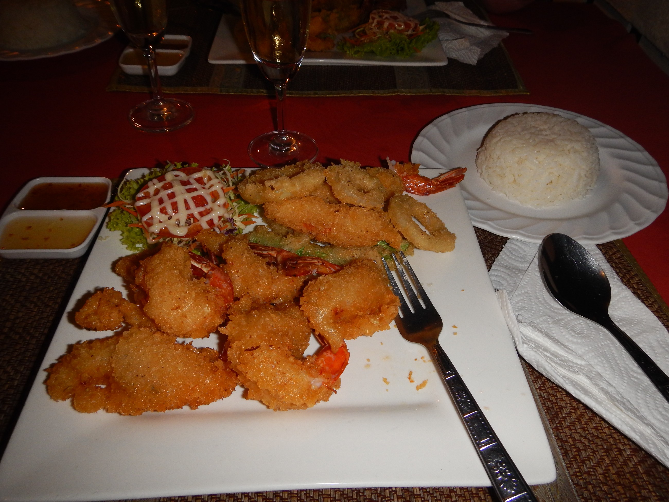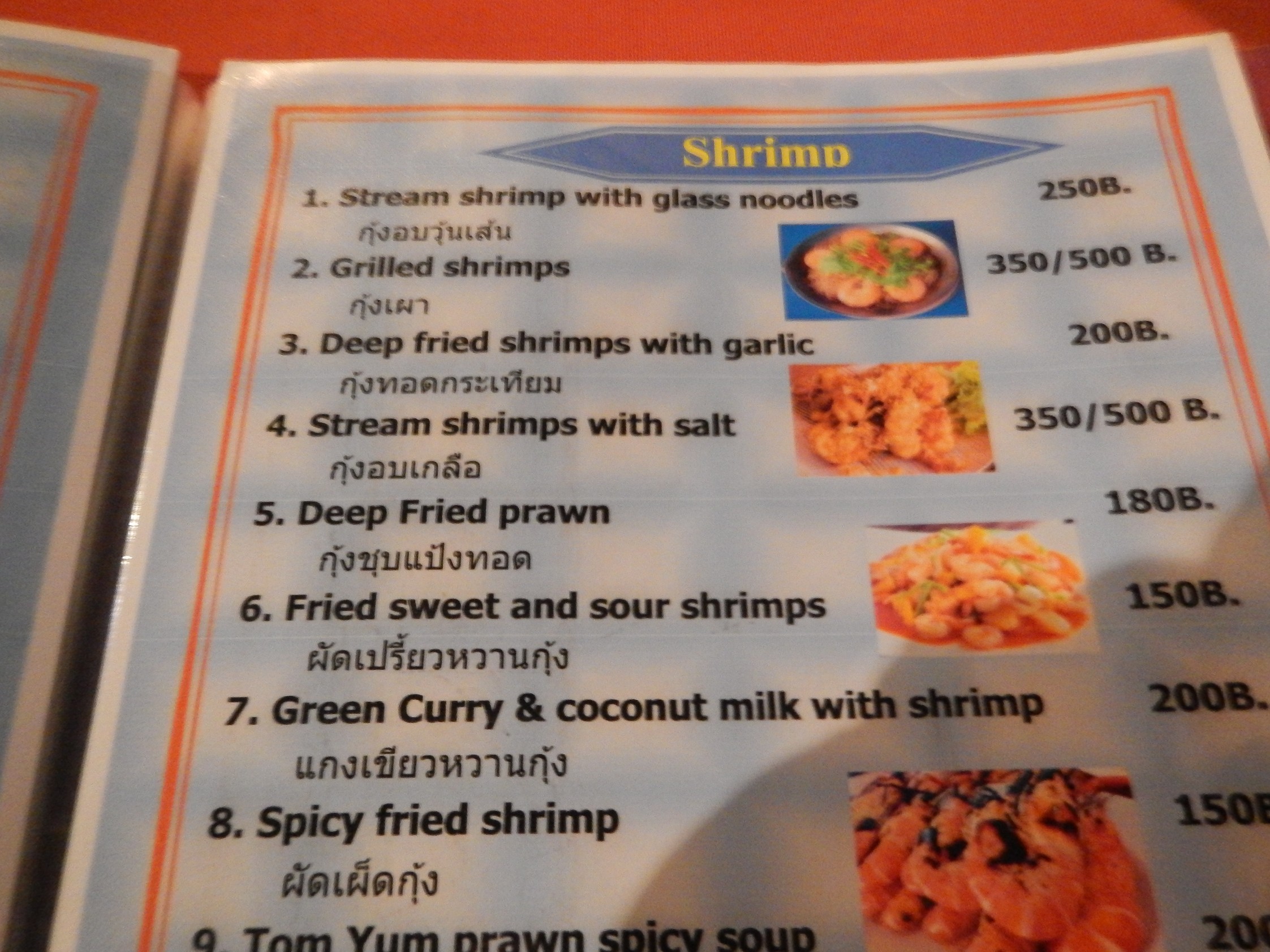 Räkor finns det i alla fall, vi tittade in på Nong Pu för att äta Rolfs favoriträtt. Nummer 5 i menyn. Deep Fried prawn för 180 THB