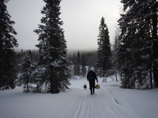 Klockan åtta på morgonen dagen efter var vi klara att starta vår avfärd, disigt väder och minus tio grader. Med hunden i koppel i en handen och soppåsen i den andra var det bara att trava på.