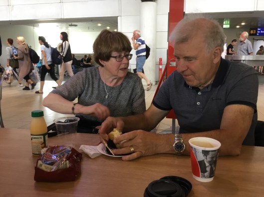 Vi startade med frukost i Uppsala, därefter tog vi en sväng förbi sonens för att lämna lite fryst köttgryta till barnbarnen. Inbillar mig att de gillar farmors husmanskost. Efter detta åkte vi med våra grannar till Arlanda och väl där passade vi på att äta lunch. Det blev kokt torsk med äggsås och potatis, smakade bra. Så var det då dags att sätta sig i ett flygplan för att ta flyget till Köpenhamn. När vi landat blev vi lite kaffesugna och det var inte lätt att hitta något ställe att fika på. Vi ville inte går för långt eftersom vi skulle byta till ett nytt flyg på samma ställe som vi befann oss. Till slut hittade vi ett litet ställe och där blev det kaffe och muffins. Nu var dessa muffins väldigt stora och vi var ganska mätta därför blev det bara en per par.