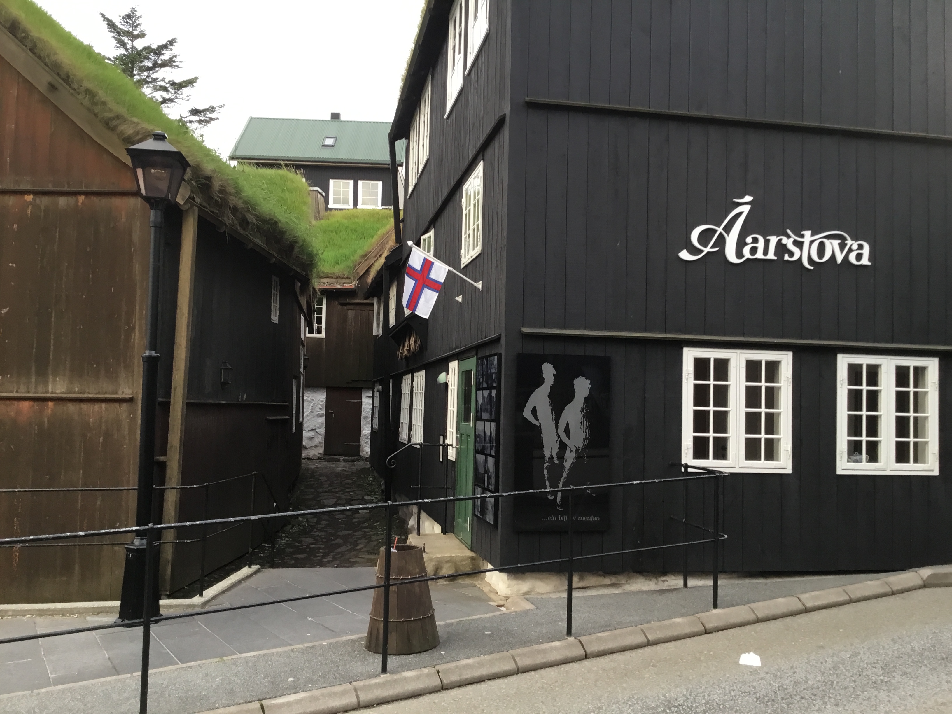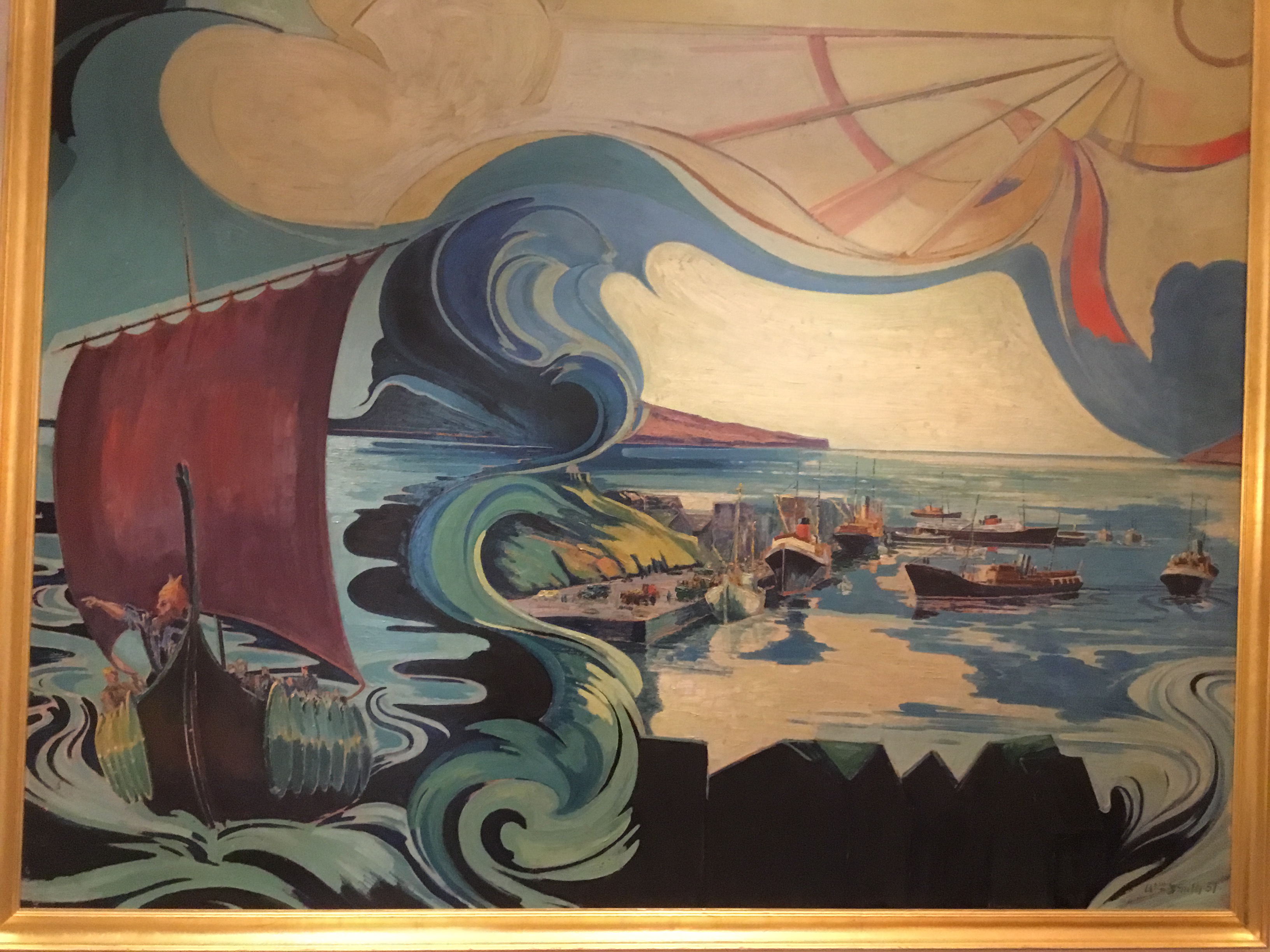 Entréns målning som visar två olika tider på Färöarna, till vänster Vikingatiden och till höger en dagsaktuell vy.