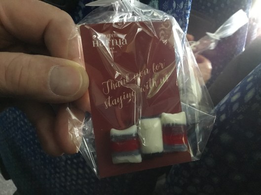 När vi åkte hem fick vi en färöisk godis att äta, naturligtvis i form o färg av den färöiska flaggan.