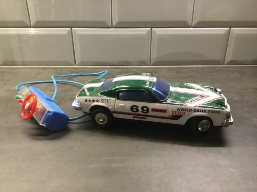 Har fortsatt min ”rensning” av förrådet, då dök plötsligt den bilen upp. En Chevrolet och inte vilken som helst. Det är min sons från hans skulle jag tro 5 eller 6 årsdag. En häftig sak som kan både köra framåt och bakåt. Svänger väldigt elegant och det bästa är att det är drygt en meter sladd med styranordning i ena änden. Det var stort då men nu tror jag att en femåring skulle titta stort och undra om man inte fattat någonting.