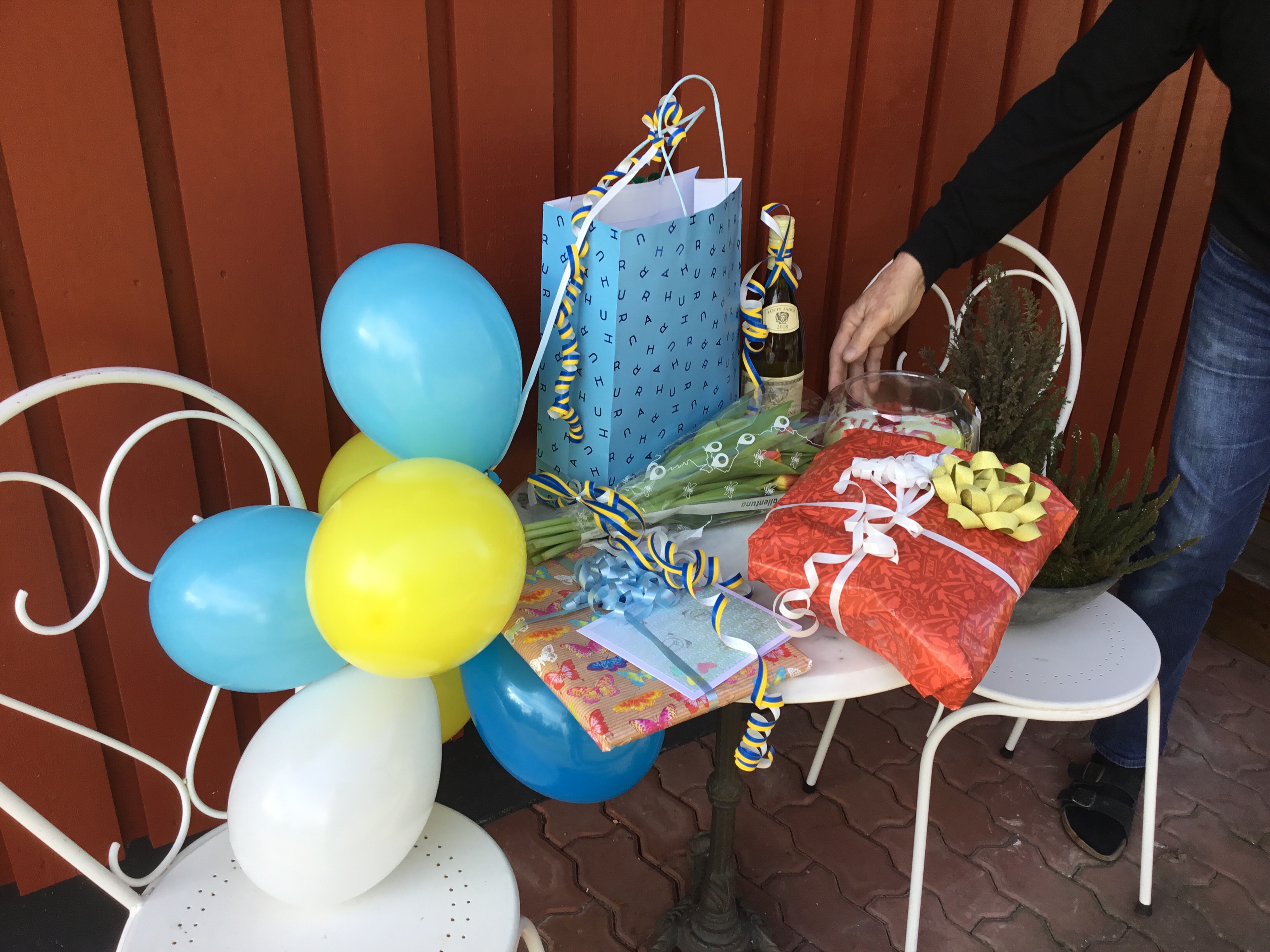 Vid sidan om trappen stod ett presentbord värdigt ett femtioårskalas. Där fanns allt, ballonger, blommor, tårta, godis,wienerbröd, presenter, kort, mm. Fem meter bort stod äldsta barnbarnet bakom en buske. Hon hade kört hit med present från henne och familjen och det kändes så fantastiskt. Det rörde till i ett farfarshjärta kan jag lova.