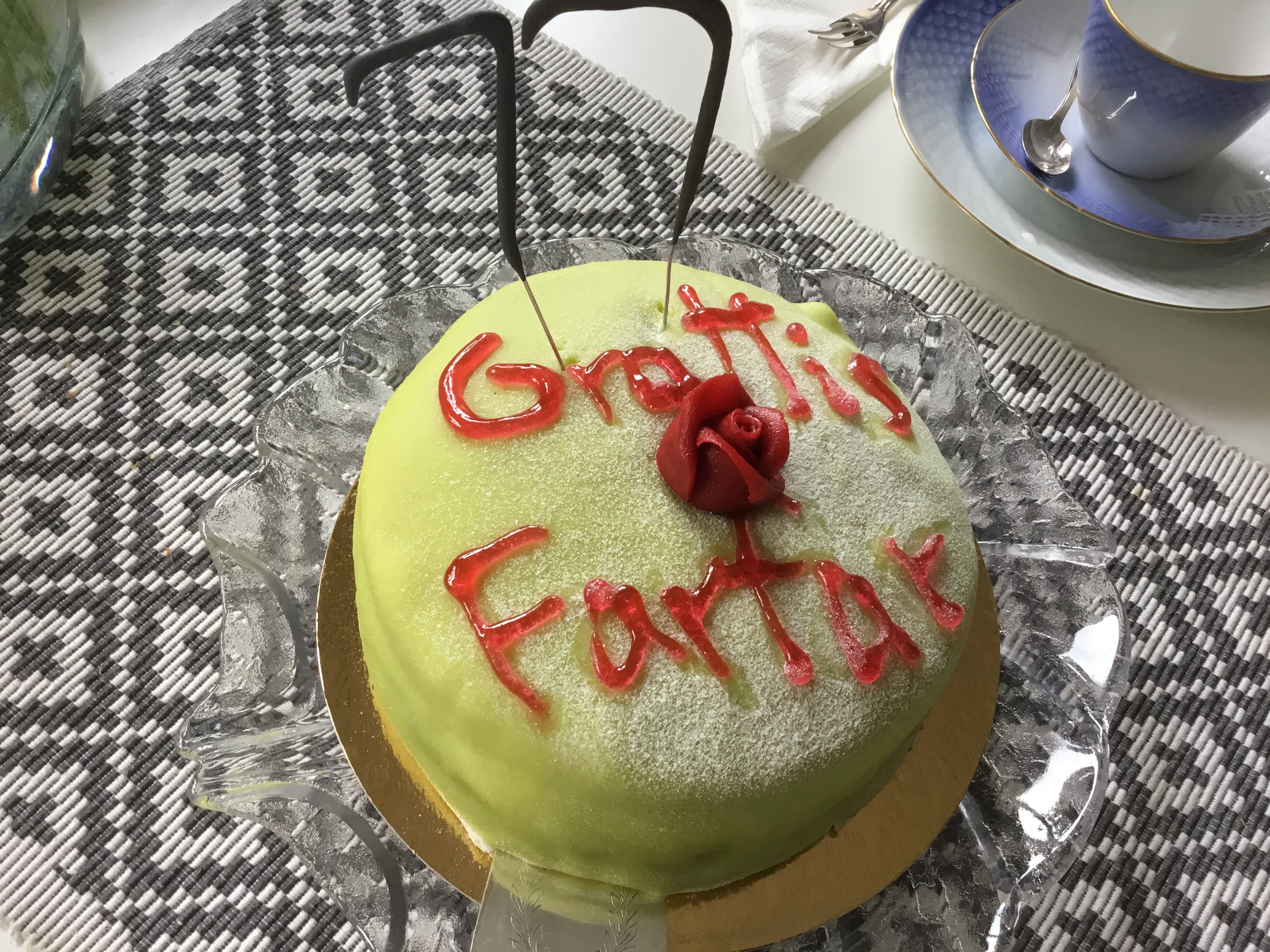 Det blev en födelsedagstårta trots allt. Vän av ordning skulle nog säga att det är för mycket kalorier för två personer. Det kan jag kanske hålla med, men nu är det så att vi går 3,5 km varje dag på vår hundpromenad. Det är 10,5 mil på en månad om vi då säger att vi måste hålla oss isolerade fyra månader. Då kommer vi att gå 42 mil och då bör väl denna tårta vara borta, eller??