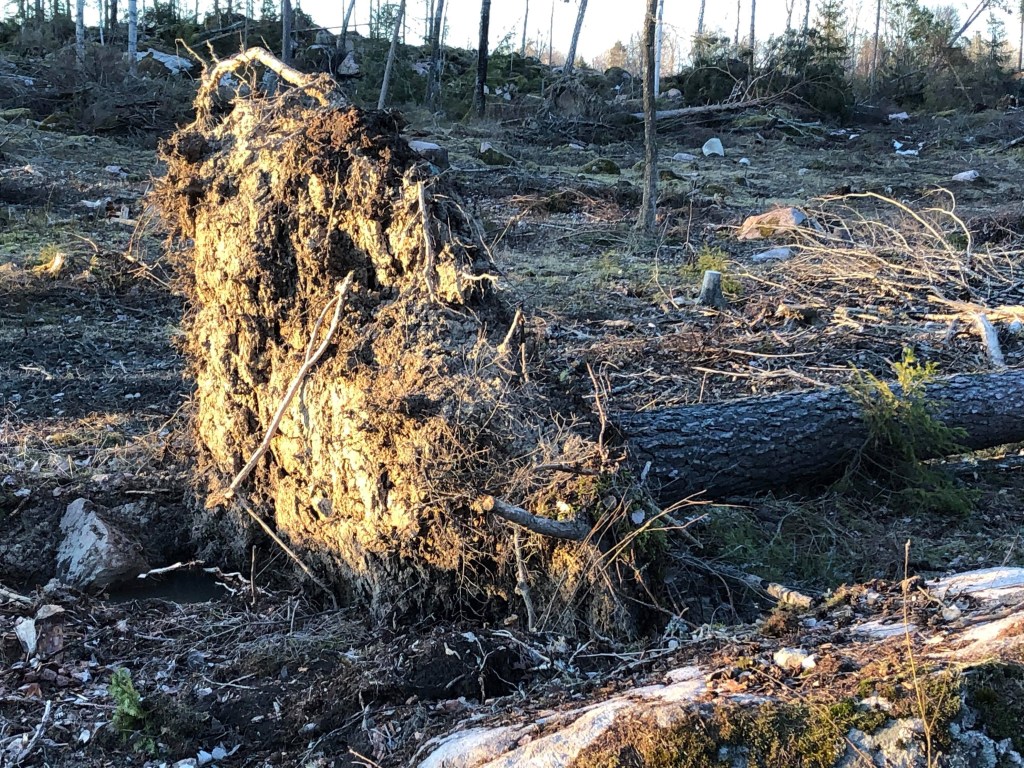 Här syntes tydliga spår inte bara ett träd utan flera hade blåst omkull och det var ganska stora rotvältor här och var.