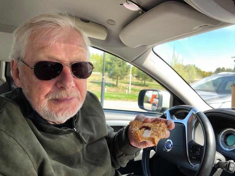 Det blev en rejäl tripp på drygt tre timmar plus fikapaus. Det var en väldigt trevligt utflykt och vi var mest i bilen förutom inköp och en minipromenad med hunden. Inte varit i närheten av någon, de vi sett är genom stängd bilruta på håll. Restriktioner är till för att följas och Rolf njöt oerhört av sin kaka ändå.