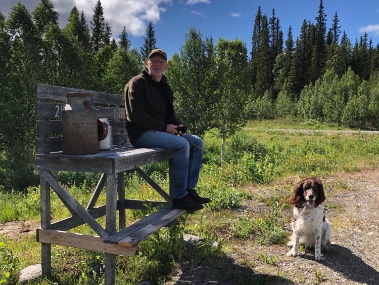 När vi kommer upp till stora vägen hör det till traditionen att man ska vila lite på mjölkpallen. Det är hunden van vid och då går det inte att hoppa över. Dessutom minner det om när man var liten och satt på pallen och väntade på mjölkbilen hos farföräldrarna.