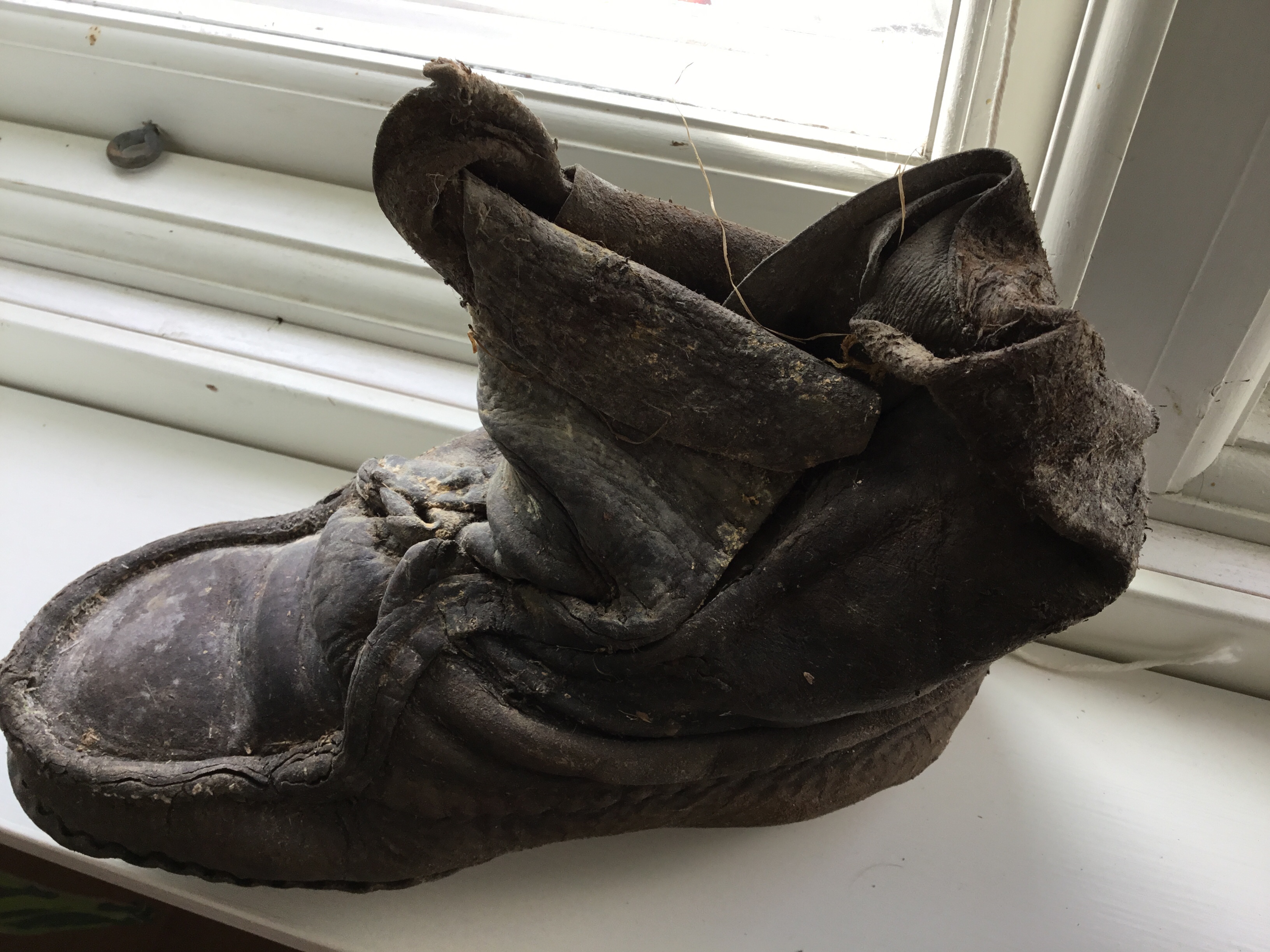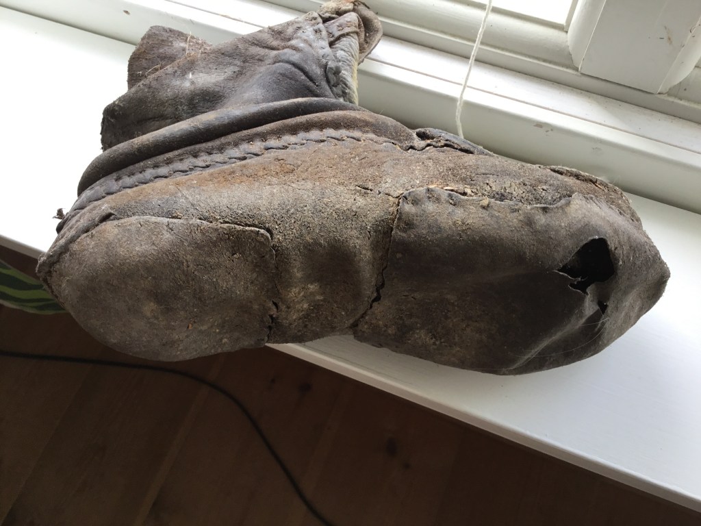 Att bo i en liten stuga på 1900 – talet långt från vägen utan bekvämligheter av något slag. Dåligt med mat och dessutom utökades familjen med 11 barn jag undrar hur vi klarat av det idag. Det sägs att inte alla barnen hade egna skor, man fick turas om att använda de som fanns. När vi skulle göra i ordning på övervåningen i stugan hittade vi bland all sågspån denna sko. Den är sliten och man kan se att den är handsydd. Hjälpte nog varken för kyla eller väta.