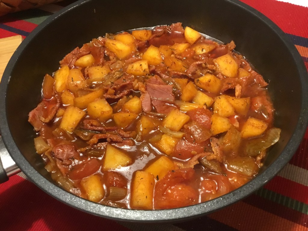 Jag tar två stora skalade tomater i stora bitar + en msk tomatpuré. Äpplet delar jag i klyftor o sedan på mitten. Löken i klyftor, En msk timjan. För enkelhetens skull skivat bogfläsk, ta bort svål o fett och skär det i stora bitar (2×2 cm) Håll tiderna noga annars kokar äpplena sönder. Servera med potatis och jag lovar att det är gott.