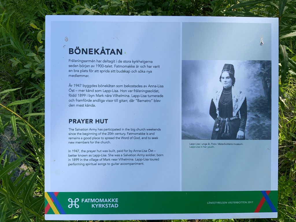 I Fatmomakke finns inte bara en kyrka utan även Frälsningsarméns bönekåta. Frälsningsarmén har sedan länge funnits i Fatmomakke, man kan läsa att redan under midsommarhelgen 1897 höll man friluftsgudstjänst på platsen. Det dröjde dock till 1940 innan det började byggas en samlingslokal och den som bekostade detta bygge var ingen mindre än Anna-Lisa Öst. Det var två personer som åtog sig att sätta upp denna träkåta och för det erhöll de en summa av 800kr. 1947 var bygget klart och den rymmer 100 personer. Anna- Lisa Öst blev känd som Lapp-Lisa men hon föddes i byn Mark utanför Vilhelmina 1889 i en nybyggarfamilj och hette då Anna-Lovisa Wikström. Så småningom blev hon rikskänd dock inte bara i Sverige utan även i våra grannländer och hon gjorde tre stora turnéer i USA. Där blev hon oerhört uppskattad och drog en enormt stor publik under sina framträdanden.