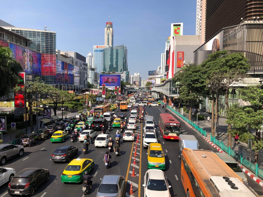 Bangkok var sig likt samma varma fuktiga luft som slår emot en så fort man sätter foten utanför hotellet. Som en tjock mur av dålig luft och ett ständigt bullrande från bilar och motorcyklar. Trafiken lika livlig som alltid men en liten promenad hade vi bestämt oss för.