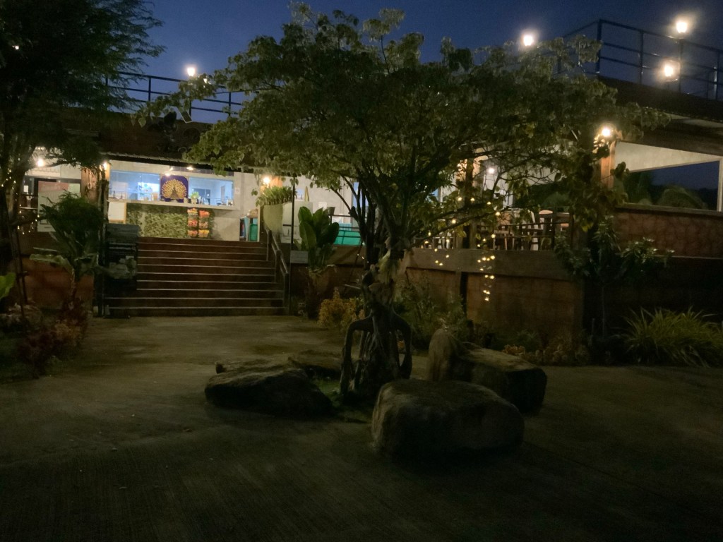 Tack vare Helikopterplattan som man kunde gå upp på fick man en väldigt fin bild av omgivningen. Dessutom ligger restaurangen lite högt vilket förbättrar det hela. På vägen upp såg vi lantbruk, kor som faktiskt såg ut som våra Rödkulla annars är alla kor ljusbeige. Mycket höns och gummiträd men även stora fält med ananasodlingar. Hade man kunnat gå runt på fälten hade man nog sett mycket mer.