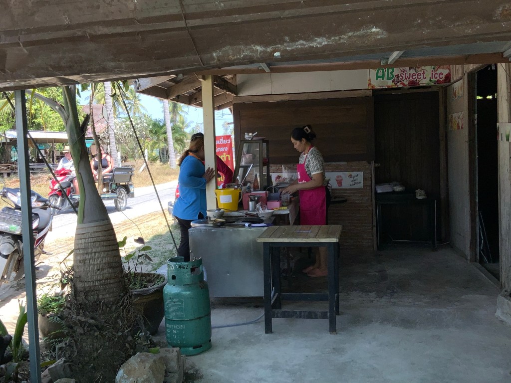 Restaurangerna i Huay Yang är inte så stora och därmed inte heller köken. Ibland frågar vi oss om de har mer är en kastrull. Skämt åsido maten man får är alltid nylagad det är dock inte säkert att ett middagssällskap på fyra personer får sin mat samtidigt. Vi har varit med om att en person har ätit färdigt innan de övriga fått sin. Det är inte heller ovanligt att man kan få vänta en timma på maten.
