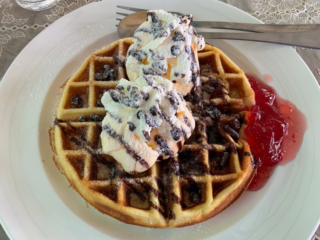 Rolfs mellanmålsfavorit är våfflor med grädde och glass samt sylt. Ingen liten portion kan jag lova. Priset 100 THB och det är den värd.