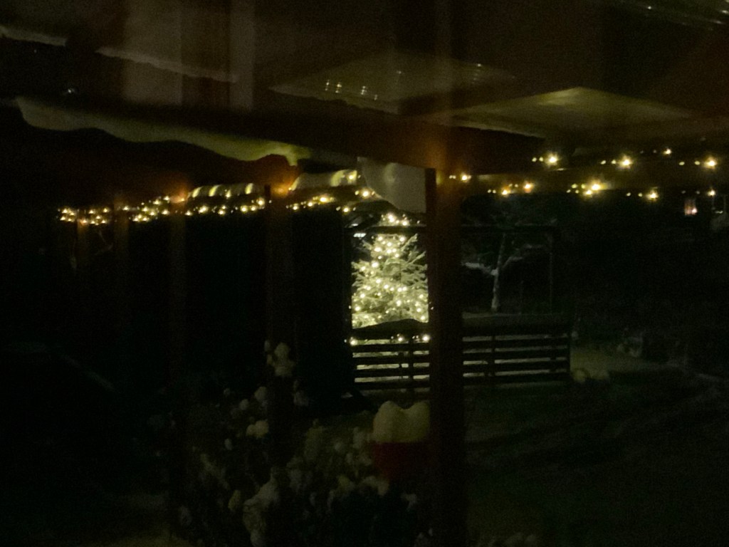 Nu är det kallt +12,5 Celsius i sovrummet så dags att sätta på värmen. Det positiva med kylan är att det blir så vackert ute. Iskristallerna glittrar så fint och snön gör sitt till med de snötyngda grenarna. På baksidan av huset har vi en ljusslinga och en utegran.