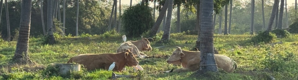 Här och där går man förbi en liten skogsbit där några korli ligger o vilar sig eller tuggar i sig lite av det sega gräset. Ofta ser man en vit fågel nära korna och det verkar som att varje ko har en egen kohäger. Vid femtiden på eftermiddagen kan man se stora flockar av hägrarna flyga över byn. Kanske övernattar de högre upp bland bergen där natten är svalare? Ja detta är inte en plats som den vanliga turisten åker till då den fortfarande är lite okänd. Men att det är en pärla kommer att synas i de kommande bilderna.