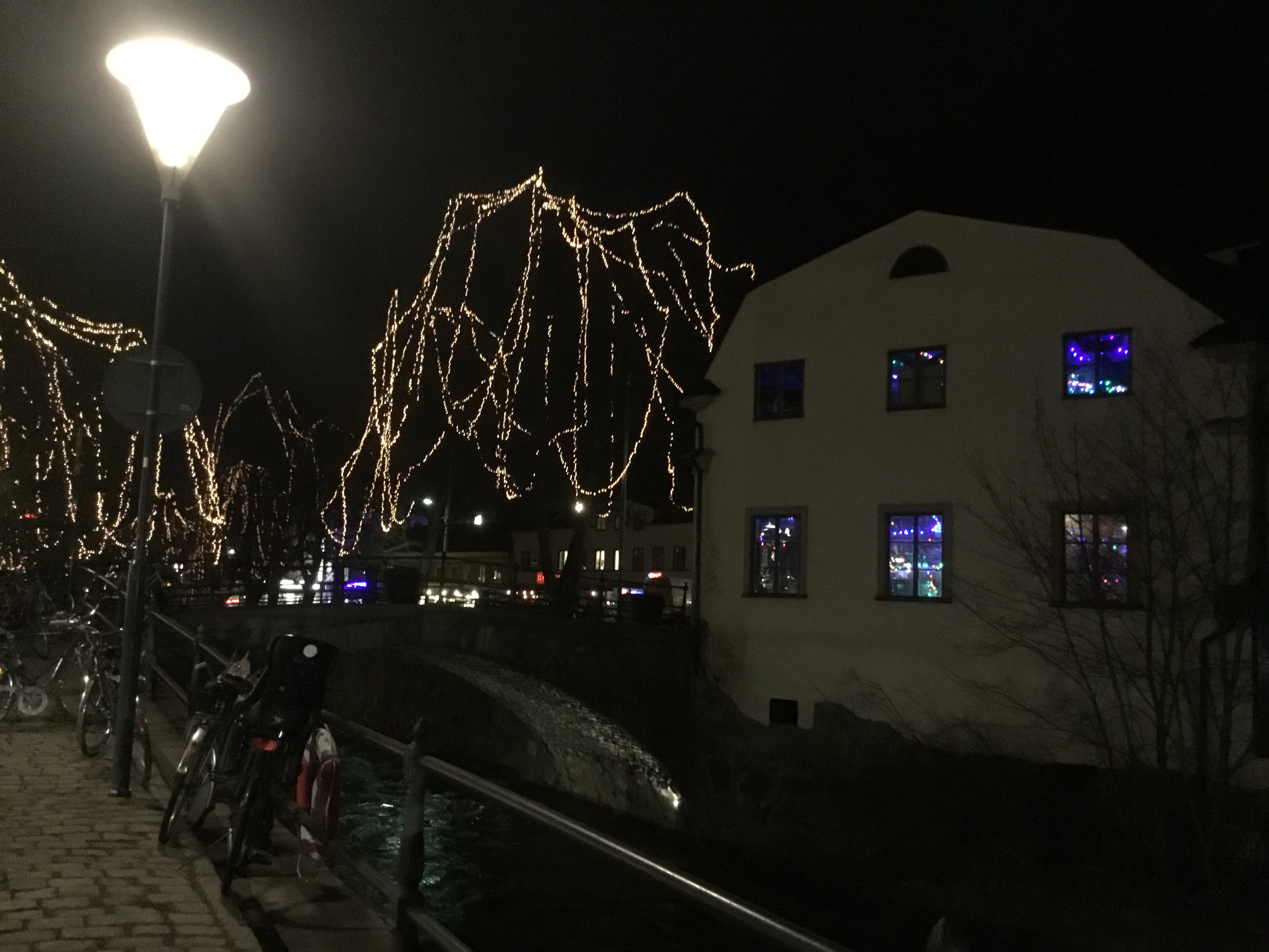 Här har träden fortfarande sin belysning kvar och i huset kan man se kulörta lampor inne på den nyöppnade thairestaurangen.