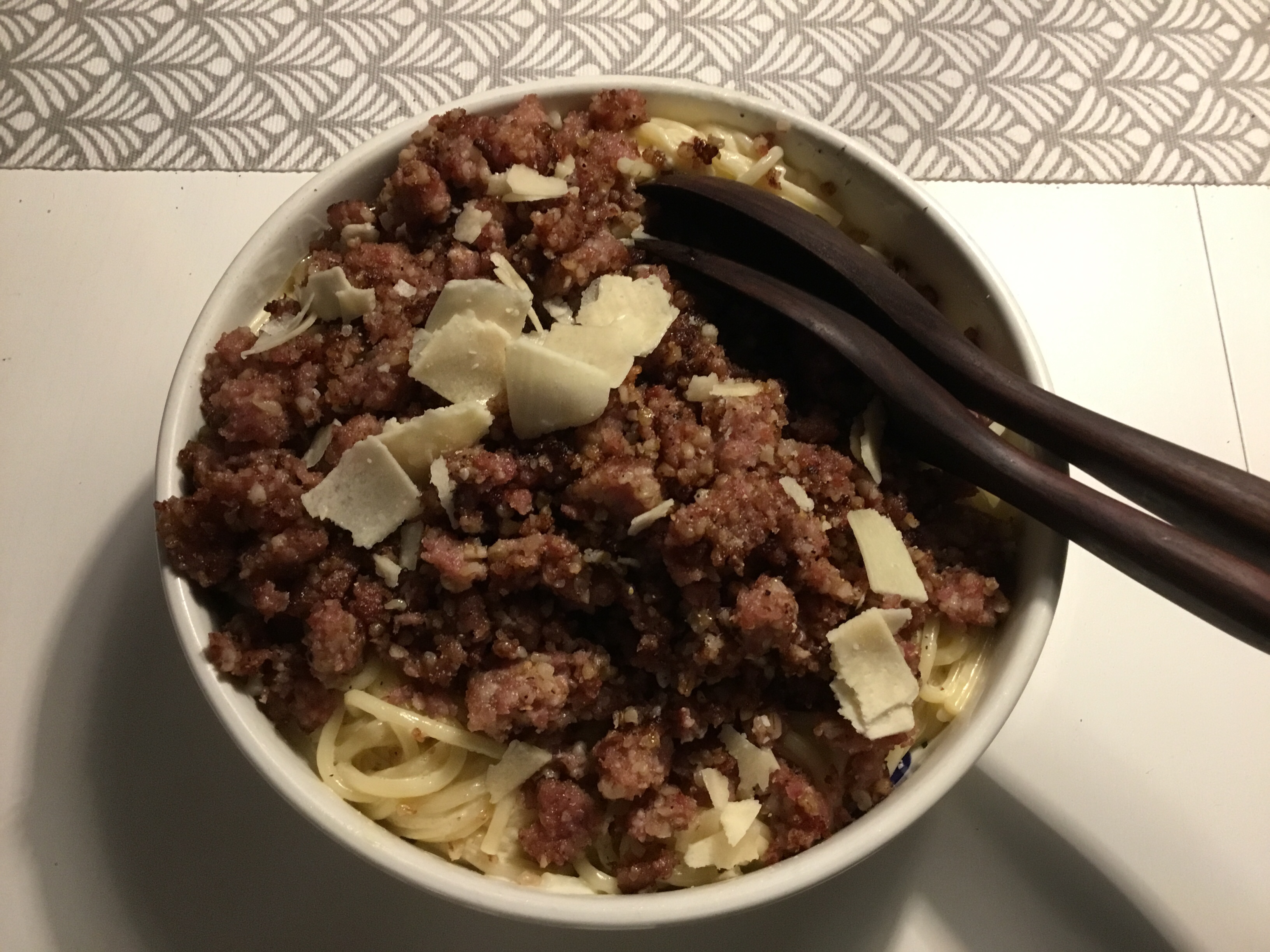 Vilken nödlösning det blev, pasta kokt med grädde o parmesanost kryddad med svartpeppar. Serverad med hackad isterband det blev en ny upplevelse.