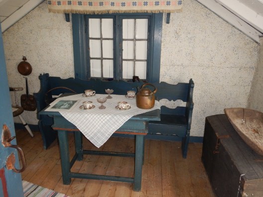 Vi hade hört att det skulle finnas ett litet fiskemuseum som nyligen startat men vi kunde inte finna det. Vi visste att vi rörde oss i rätt område för det skulle finnas vid Garpahamnen men det stod inte att finna. Till slut såg vi fyra män som satt vid ett bord så vi frågade dem. Det visade sig att vi var rätt men själva museet var ny målat och därför ingen skylt. Det är uppfört helt på ideellt grund och de som arbetar där med att berätta om gamla tiders fiskar -och lotsliv är superduktiga. De har samlat in bilder från i princip alla boende på ön.