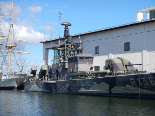 Här är torpedbåten Västervik och om dess bravader finns det mycket att läsa. Hunden och jag satt på en bänk och fick plötsligt se Rolf sitta och dingla med benen på båten tvärs över den lilla viken. Jag tvivlar starkt på att dess besättning fick göra det när båten var i bruk.