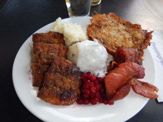Nedan en bild på dagens höjdpunkt, buffén i museirestaurangen. Dagens meny bestod av mina tre favoriträtter. Blekingska kroppkakor med vit sås, stekt strömming med potatismos och Rålåper (raggmunk) med stekt fläsk och lingon. Gick inte att välja så det blev lite av varje plus hemgjord glass och kaffe efteråt. Där var i alla fall hunden välkommen och han fick en rejäl portion mat.  Talar inte om av vem och tänk de hade specialpris för pensionärer det är det inte ofta man ser.