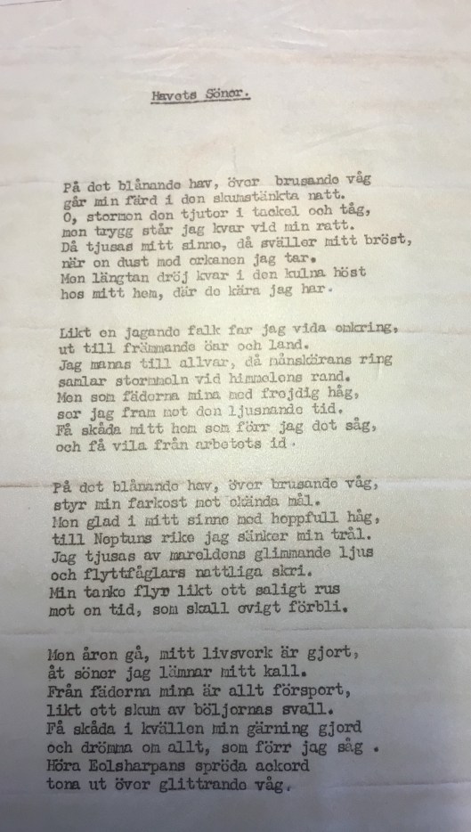 Hittade även texten till en sång om havets söner, mäktig och allvarstyngd.
