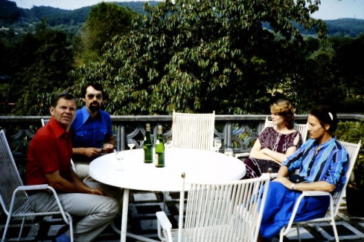 Han skriver att vinerna är delikata med underliggande koncentration, friskhet och balans, som mycket tydligt speglar vinernas ursprung från de olika lägena. Mitt minne från denna vingård, är att de olika odlingarna var väldigt sluttande och att marken innehöll mycket skiffer. Detta skiffer ger smak åt vinet, varje gång jag har förmånen att få smaka på detta vin känner jag skiffersmaken i bakgrunden. Det finns 30 åriga viner från denna vinproducent som   har kvar sin smak och balans, men de tillhör nu dessvärre vinvärldens rariteter. Själv kan jag bara hoppas på en Gotlandsresa till hösten och att vår ”vinlärare” kanske har en flaska kvar. För en smaksensation i de högre höjderna. På fotot nedan sitter Villi Sylve, Willi Schaefer, jag och Inez på hans balkong och njuter av såväl vin som utsikt.