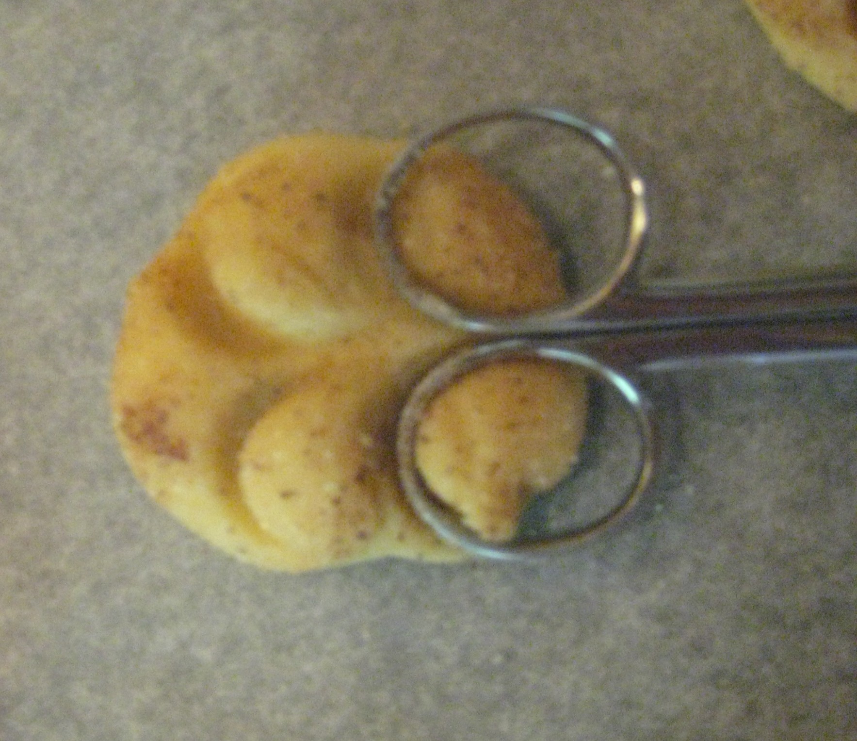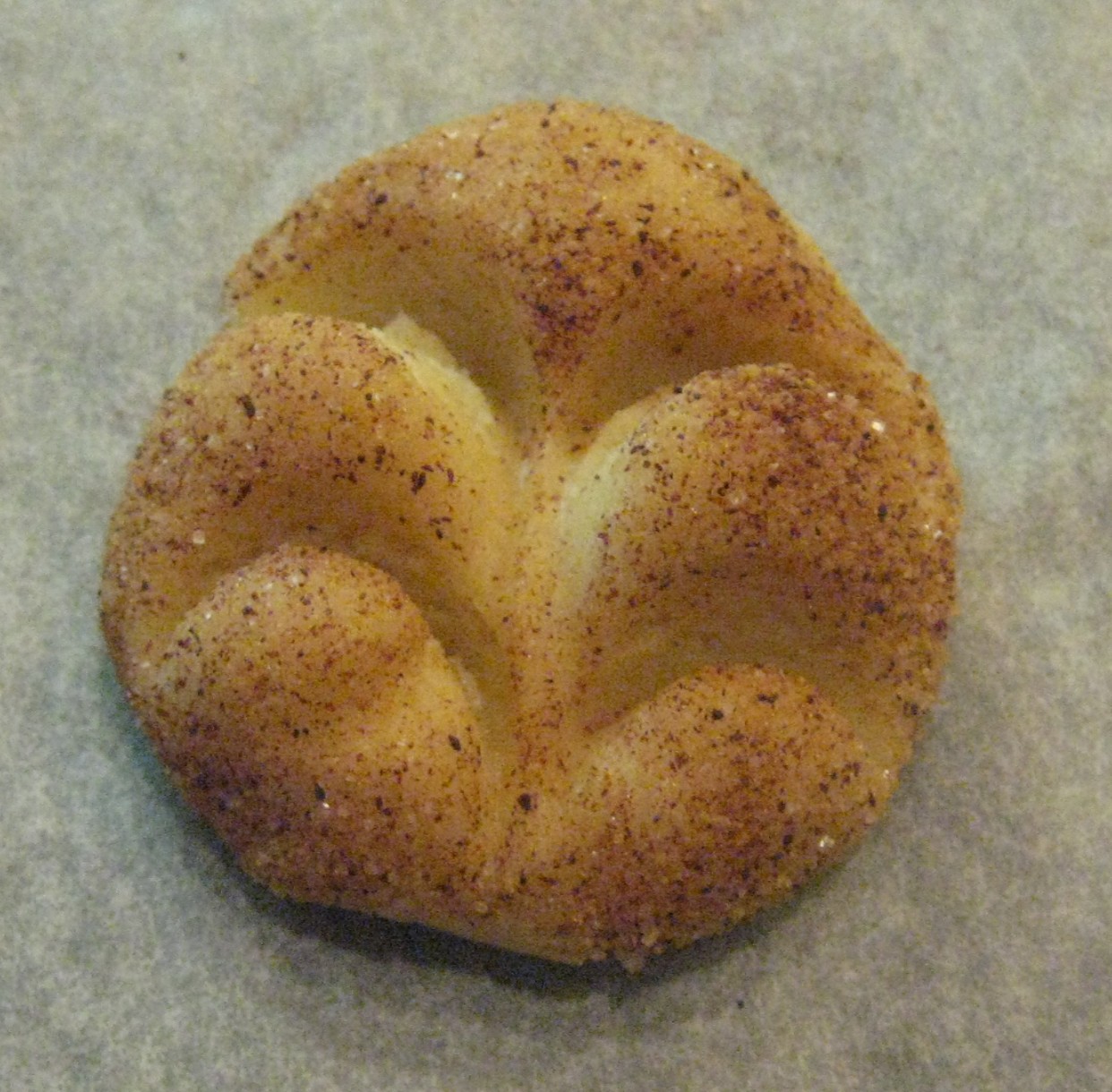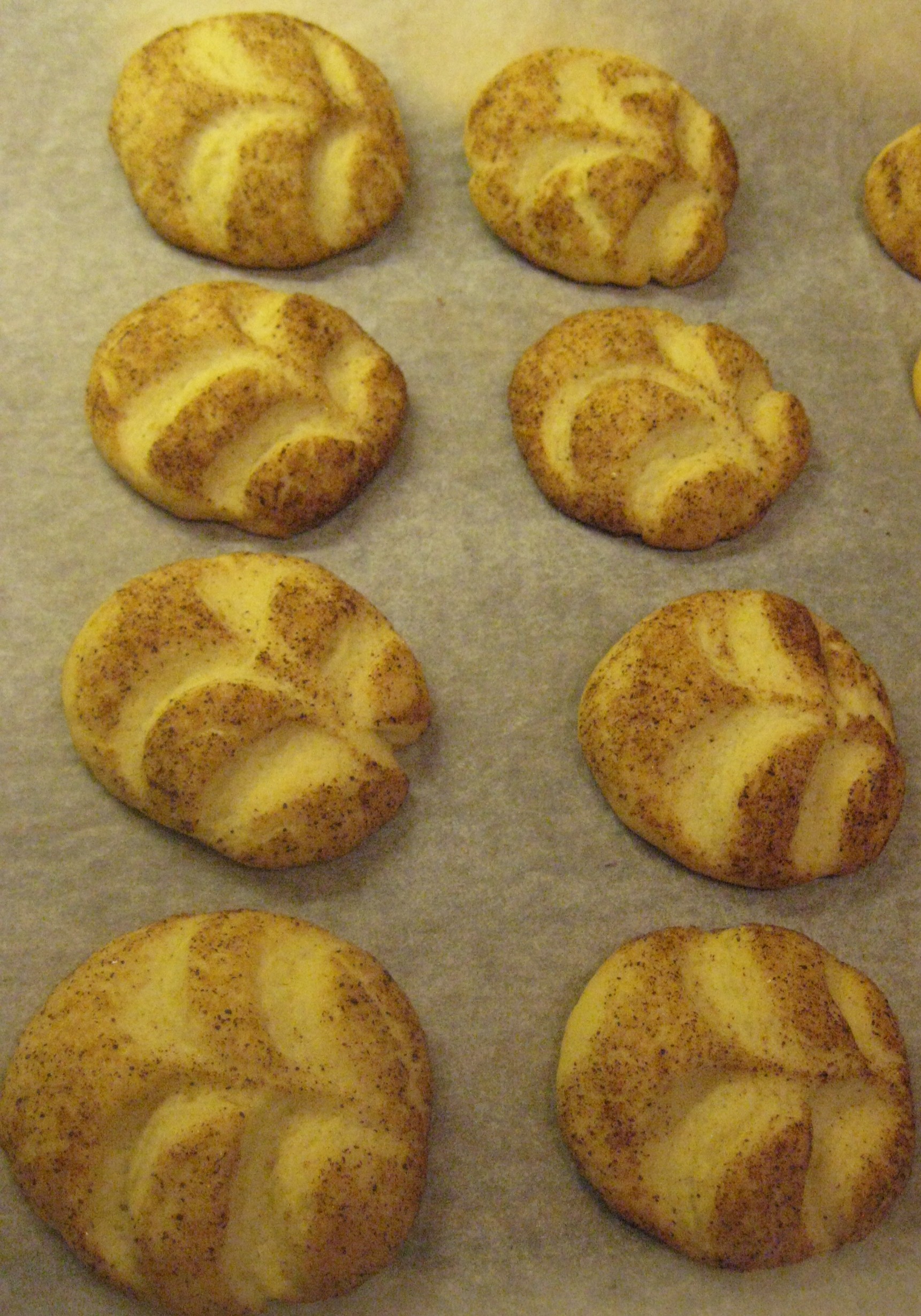 3 hg margarin röres mjukt tillsammans med två kaffekoppar socker, rör i två ägg och rör om. Häll sedan i två teskedar bakpulver blandat med fem och ett halvt hekto vetemjöl. Rulla ut längder och skär ut 40 – 45 lika stora bitar. Rulla dem till bollar och doppa i kanel och strösocker som blandats. Mönstret gör man med en sax.