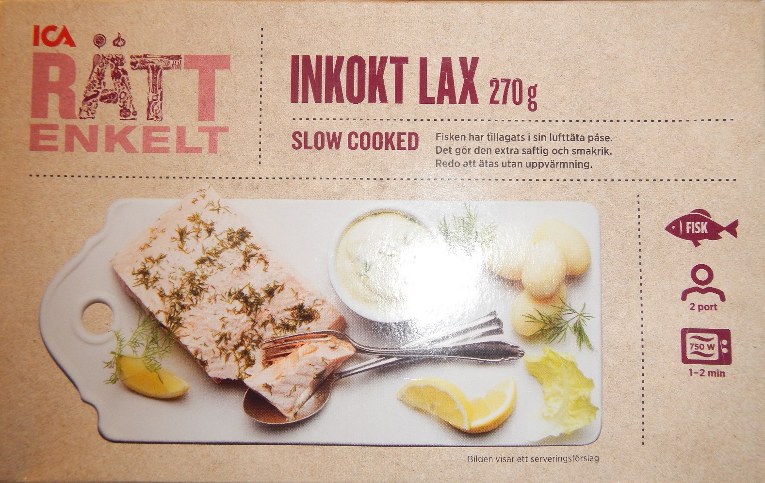 I vilket fall så gick jag förbi kyldisken på ICA häromdagen och när det gäller att upptäcka nyheter har jag falkögon. Fick alltså syn på det här paketet innehållande ”Inkokt lax” slow cooked ur ICAs nyheter ”Rätt enkelt”. Fastnade för den och det slank ner ett paket i min varukorg.