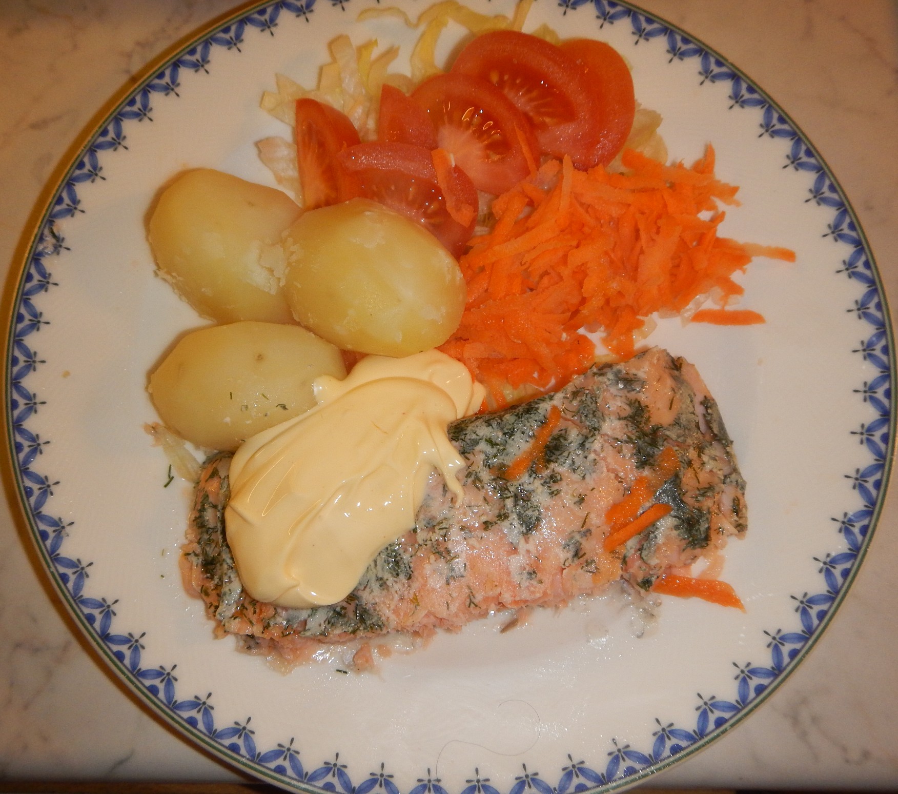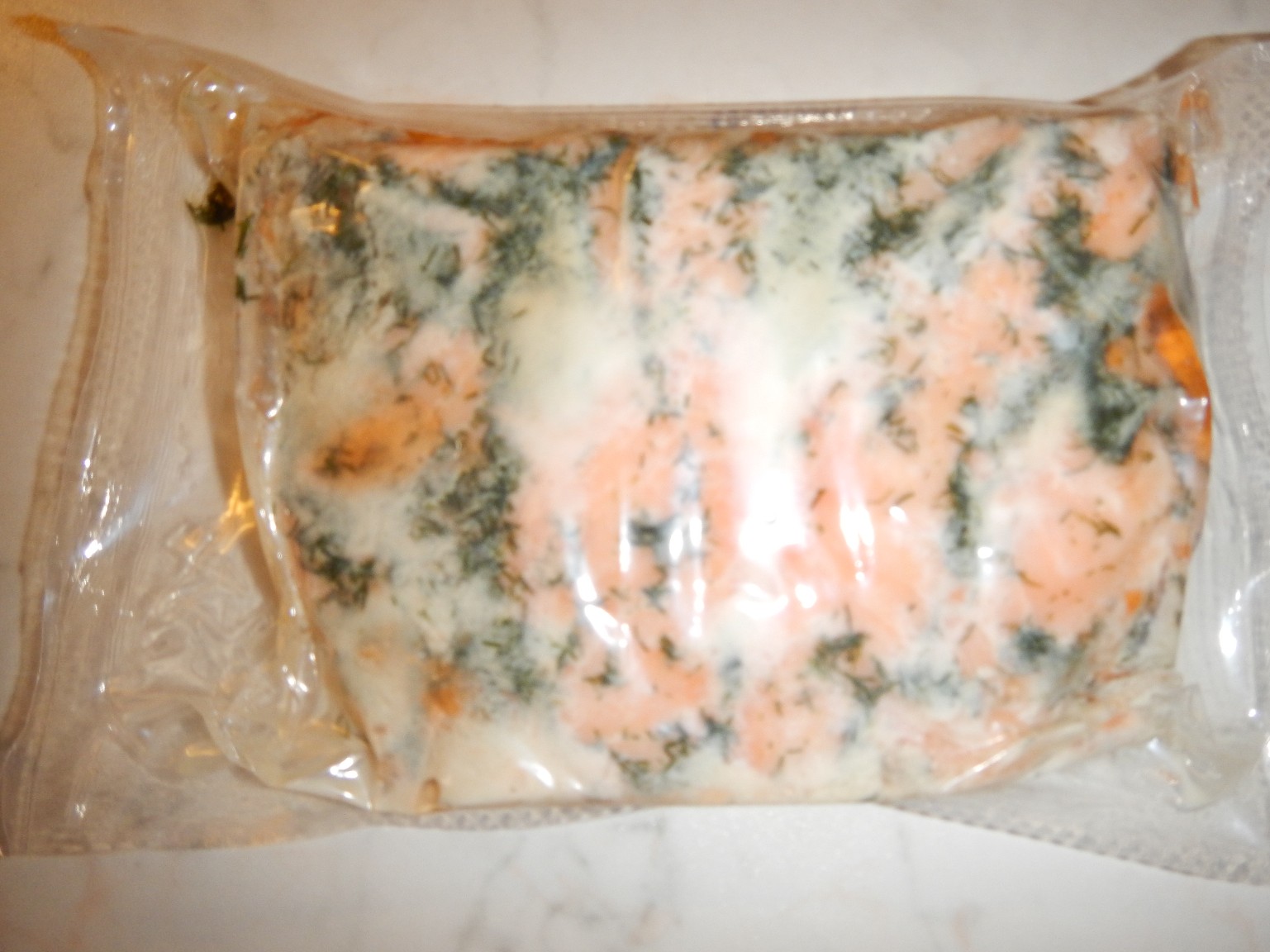 När jag öppnade paketet låg där en bit lax i vacuumförpackning och den var helt OK. Det vita som syns på bilden är bara lite fett som alltid blir när man kokar lax. Bara att stryka av.