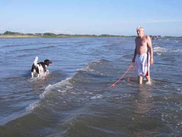 Jag funderade vart vi skulle när husse bad mig hoppa in i bilen igen. Döm om min förvåning när vi åkte tvärs över landet i stället för norrut. Så småningom kom vi fram till en plats som heter Björkäng. Så fort husse öppnade bildörren hörde jag flera olika hundskall, det lät lovande i mina öron.Efter att vi kommit till rätta tog vi en promenad till havet, då förstod jag, dett var min semester.