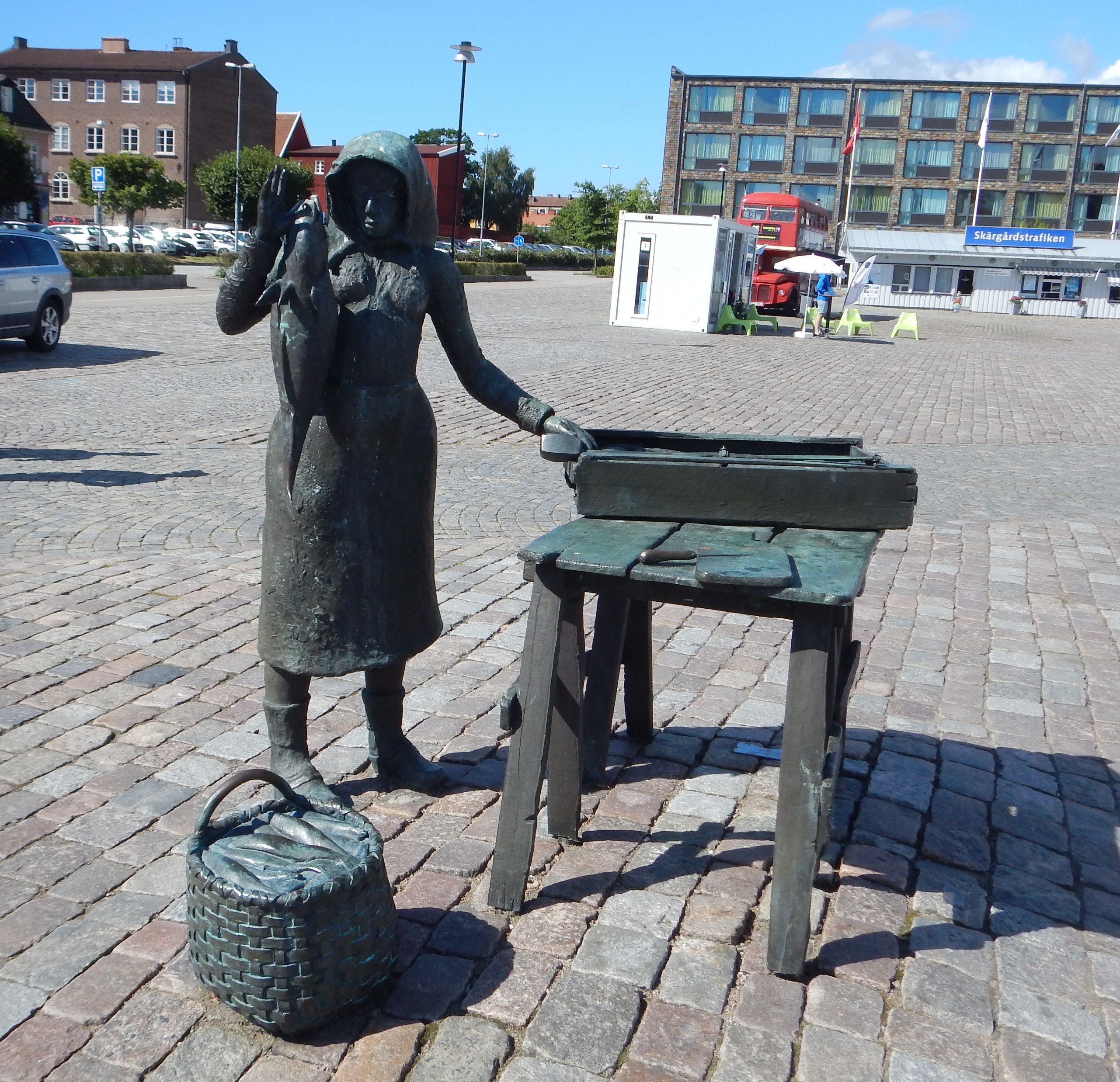 Vi startade på Fiskartorget i Karlskrona det ligger i direkt anslutning till hamnen. Därifrån går de flesta skärgårdsbåtarna men förr låg det även till lite fiskebåtar där. Det var här som det stod en massa fiskargummor och sålde fisk. Fisken låg i trälådor och de som köpte hade ofta en korg med sig att lägga dem i. Den stående frågan från köparna var; hur mycket kostar strömmingen kastet. Fiskarna var kalla och ofta blåste det så gummorna hade fingervantar för att inte frysa, de var halva över fingrarna för att få grepp med handen. Idag står det inga gummor där men väl en väldigt vacker staty av Fiskargumman som är gjord av Erik Höglund och den ställdes upp 1982.