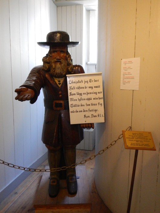Rosenbom fungerar som kyrkans insamlingsbössa och den används än idag. Allt som läggs i den går till välgörande ändamål. Han håller en skylt i en handen med följande text.