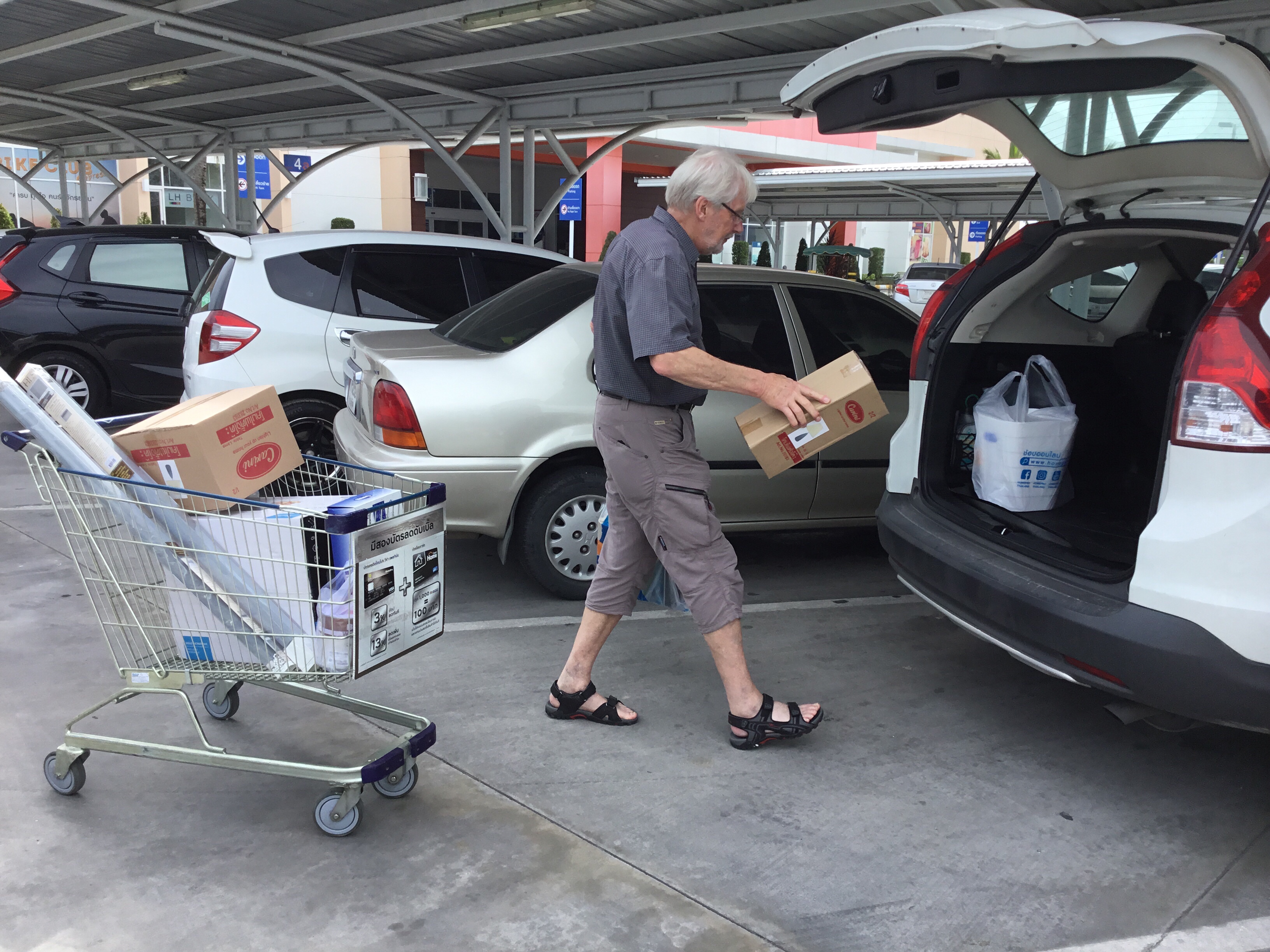 Det var en hel del som måste kompletteras i huset så en shoppingtur till Tesco i Prachuap var nödvändig. Motorcykelhjälmar, kastruller, mat med mera. Rolf var dock kaffesugen så det måste åtgärdas innan vi började men vi lyckades inte hitta något ställe för kaffe. Vi hittade dock Svensen’s